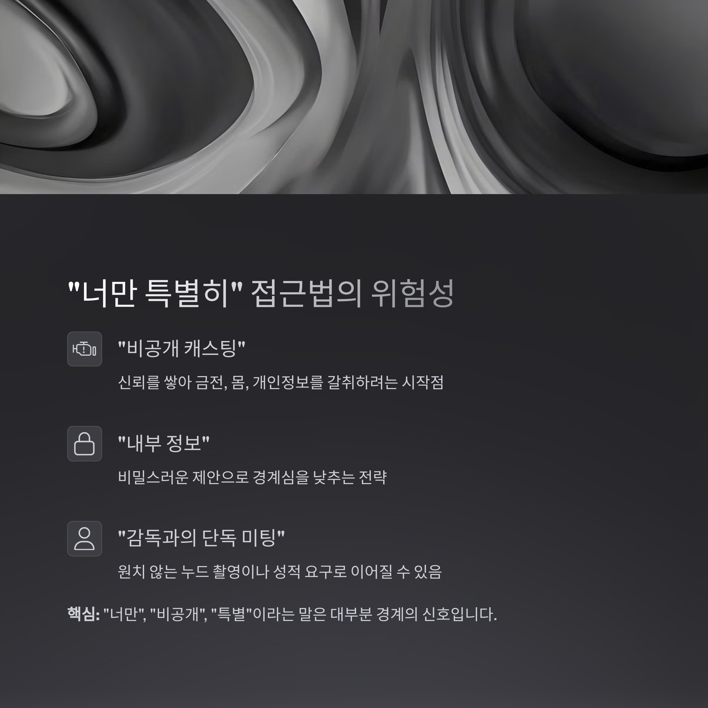 | "너 진짜 얼굴 된다, 내가 키워줄게" | 과도한 칭찬, 1:1 미팅 요구 |