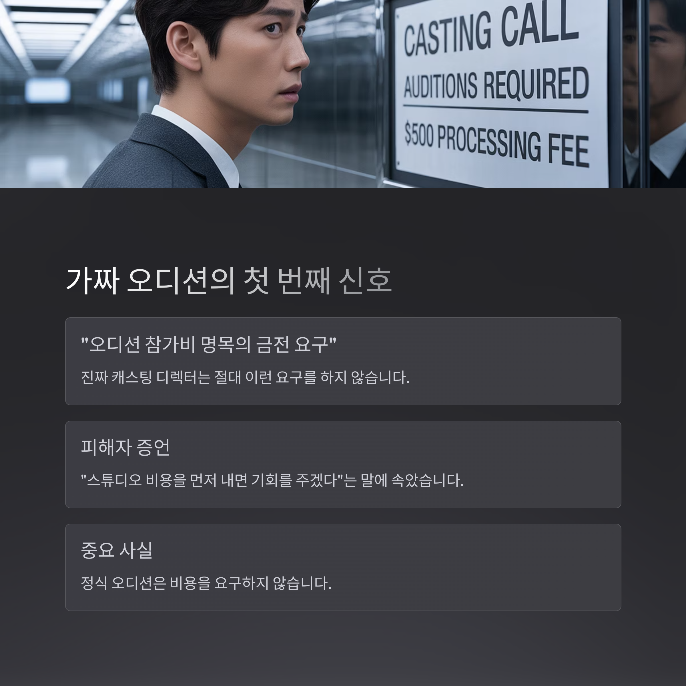 가장 흔한 수법 중 하나는 "오디션 참가비 명목의 금전 요구"입니다.