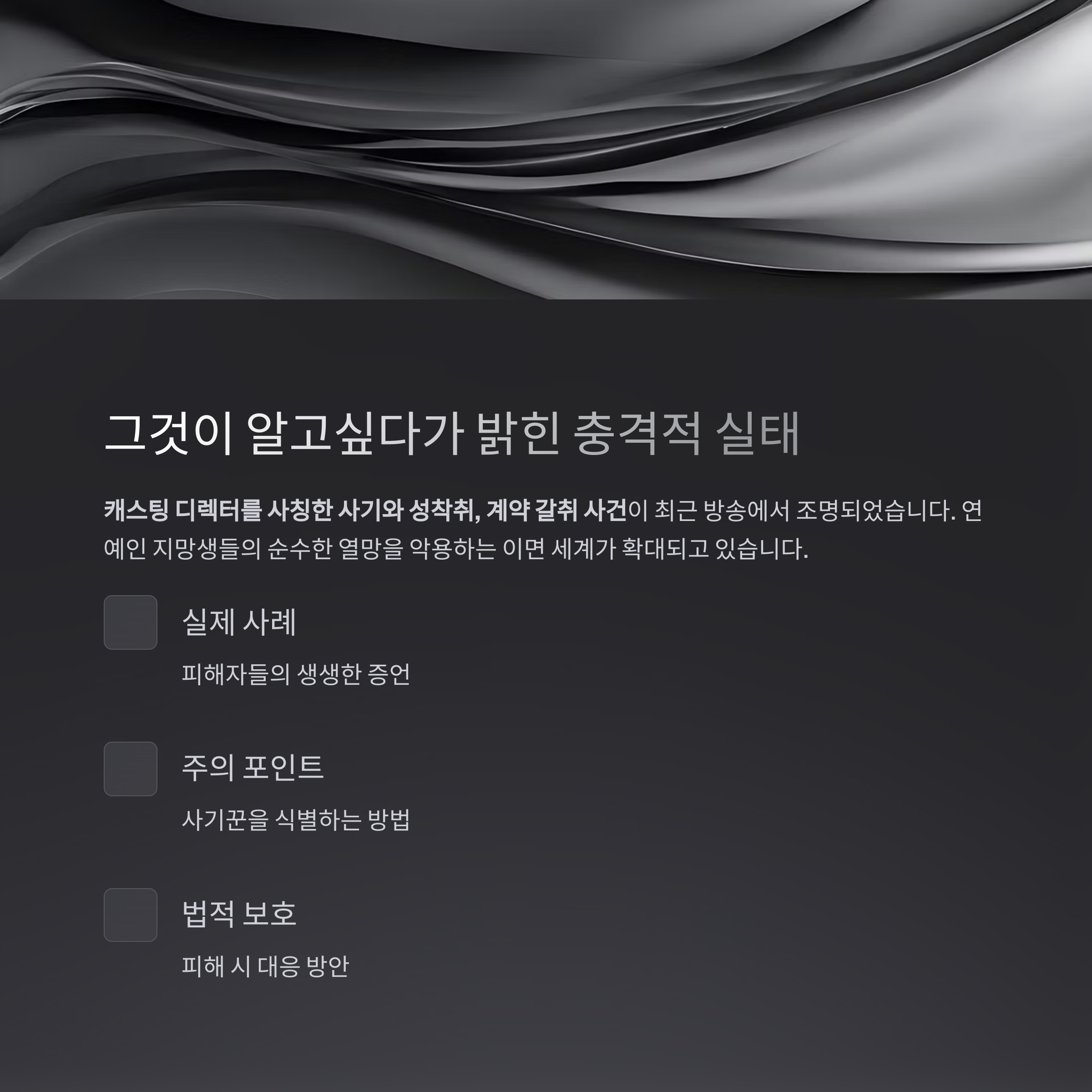 연예인을 꿈꾸는 이들이 많아지면서, 이들의 순수한 열망을 악용하는 이면 세계도 동시에 커지고 있습니다.