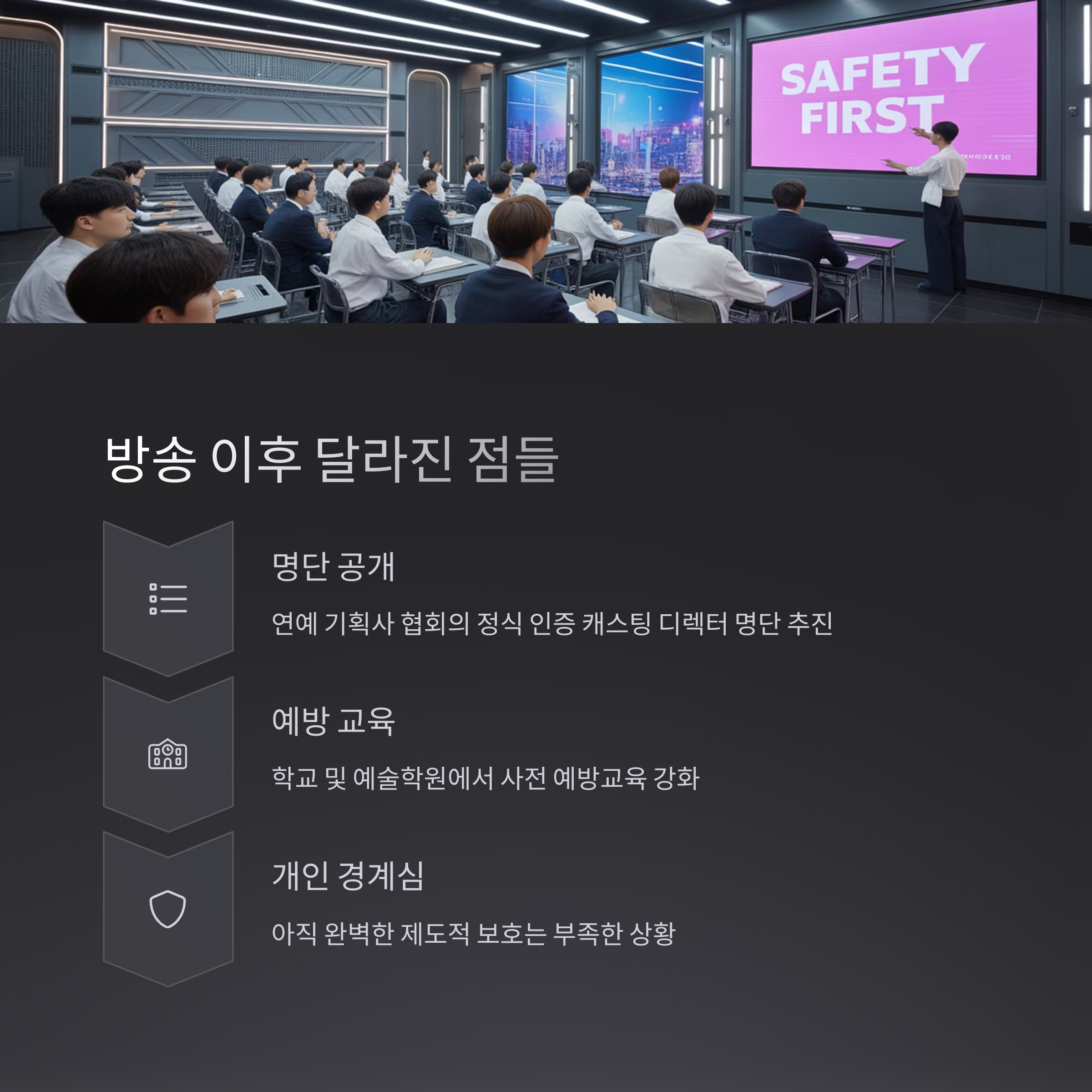 이 방송 이후, 연예 기획사 협회 측은 정식 인증된 캐스팅 디렉터 명단 공개를 추진 중입니다.