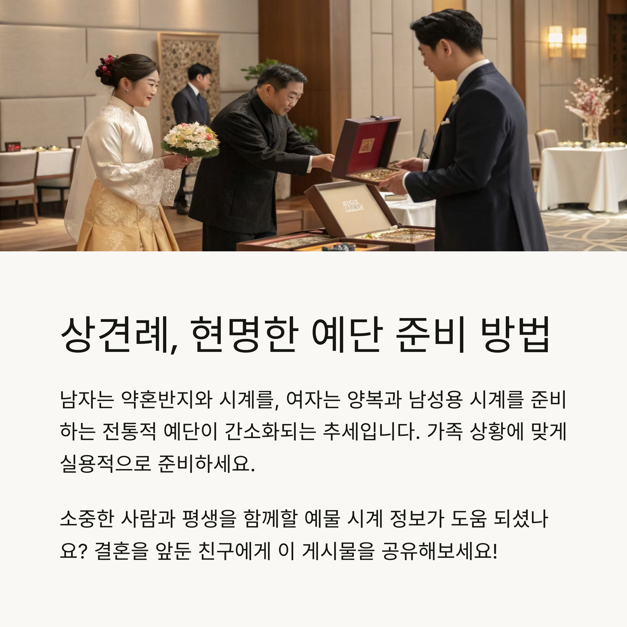 최근에는 과도한 예물·예단 대신 실용적이고 의미 있는 품목으로 간소화하는 추세입니다.
