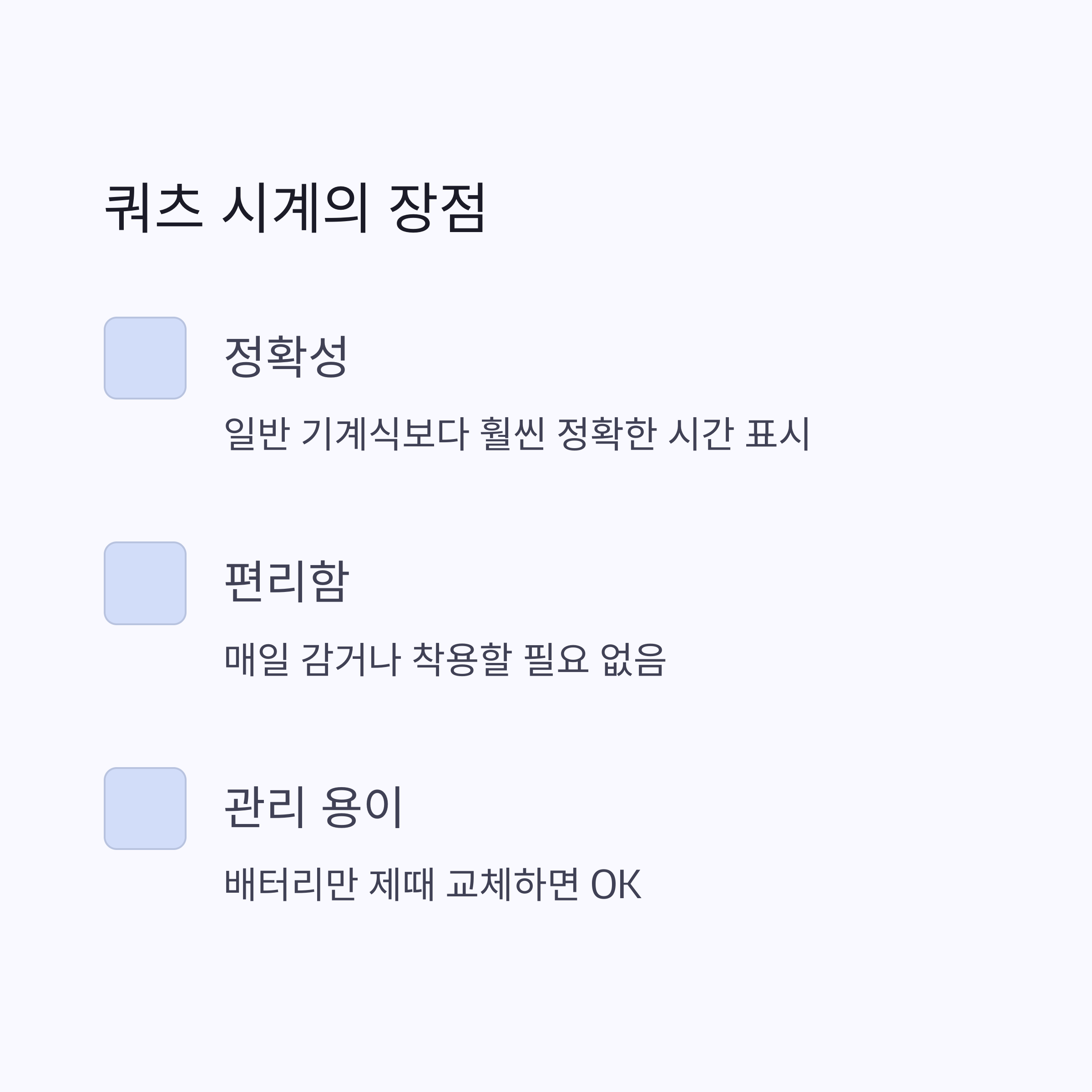 쿼츠 무브먼트의 가장 큰 장점은 정확성과 관리의 편리함입니다.