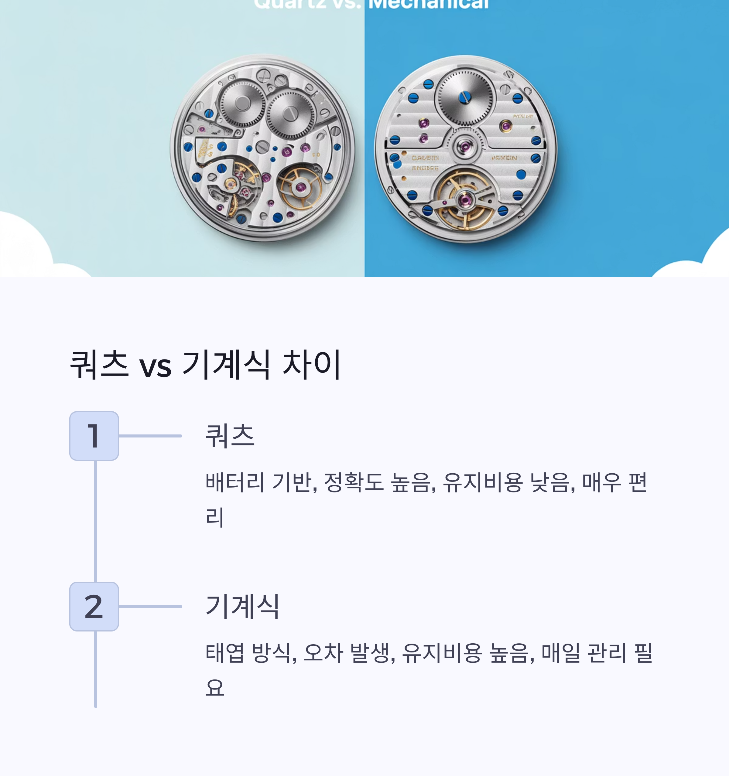 | 항목 | 쿼츠 시계 | 기계식 시계 (수동/자동) |