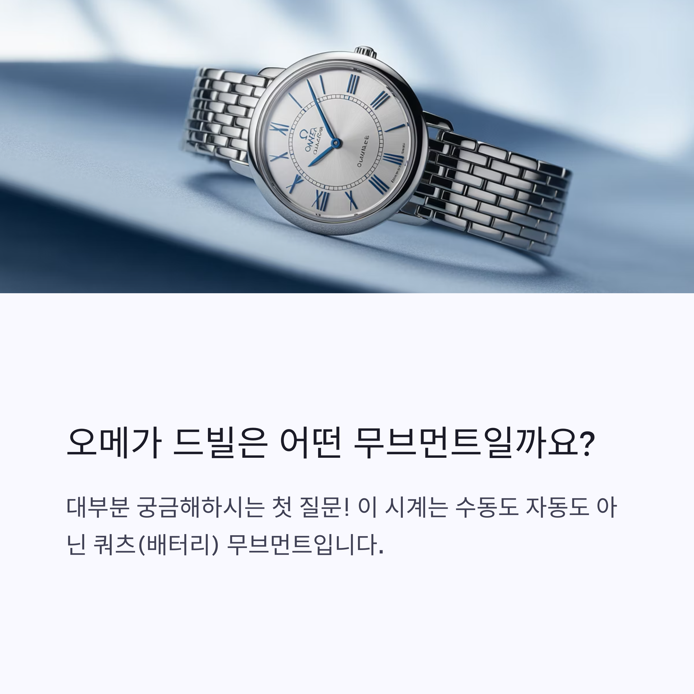 사진 속 오메가 드빌 여성 시계는 '쿼츠(Quartz)' 무브먼트를 채용한 모델입니다.
