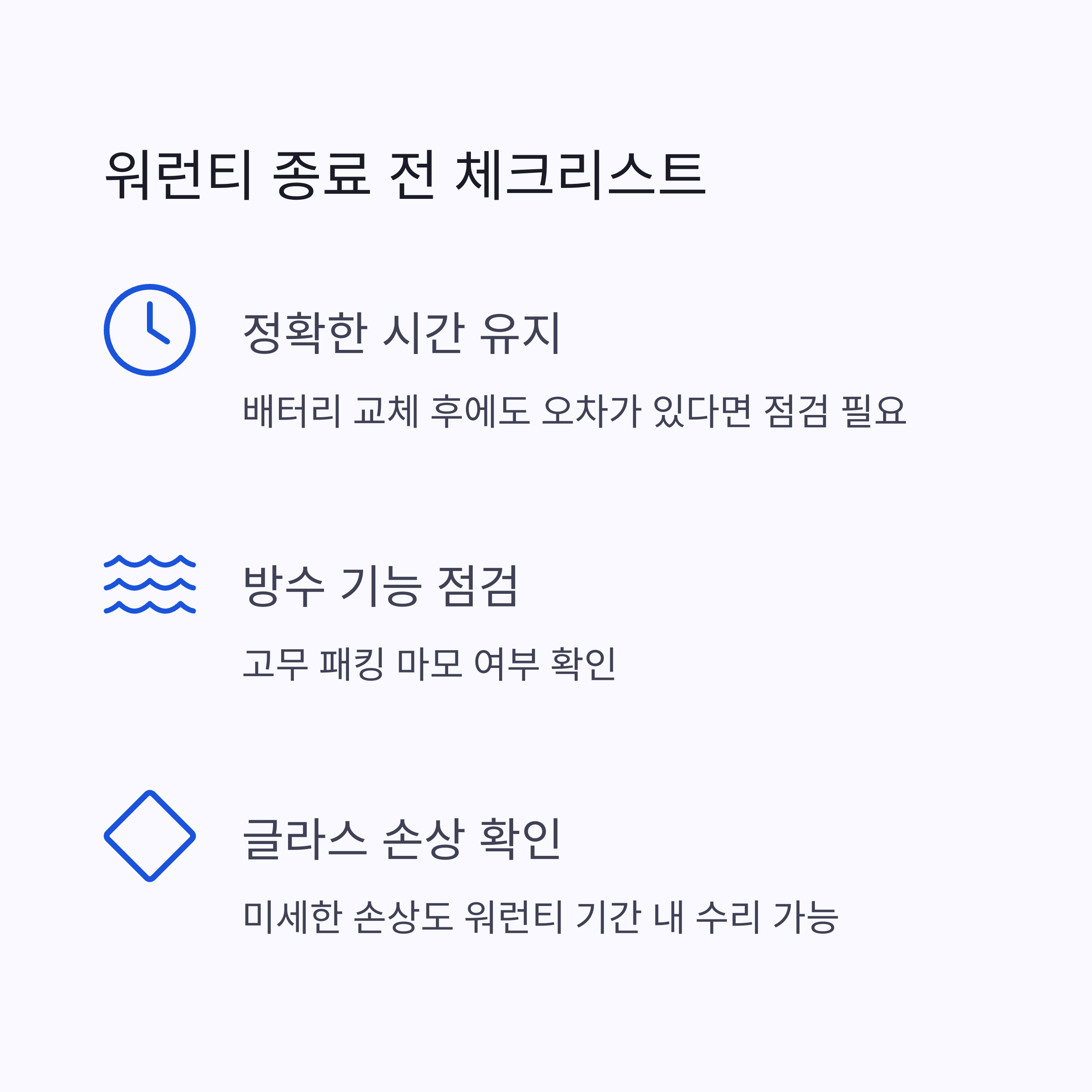 워런티가 끝나기 전 점검을 받는 것이 좋습니다. - 생활 방수 기능 정상 작동 여부 점검