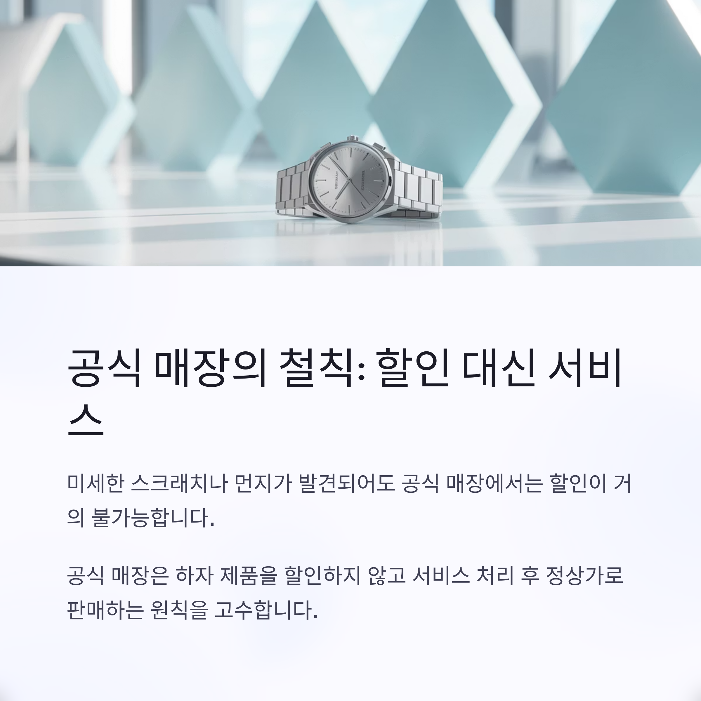 시계를 구매하려다 보면 매장 진열대에 놓인 시계에 미세한 스크래치나 먼지가 있는 걸 볼 때가 있습니다. 이럴 때 소비자 입장에서는 “그렇다면 이 제품은 조금이라도 할인이 가능하지 않을까?” 하는 기대를 품을 수 있지만, 결론부터 말씀드리면 공식 매장에서 그런 할인은 거의 불가능합니다. 이 글에서는 왜 그런지, 그리고 소비자가 어떤 점을 유의해서 구매해야 하는지를 자세히 설명해드리겠습니다.