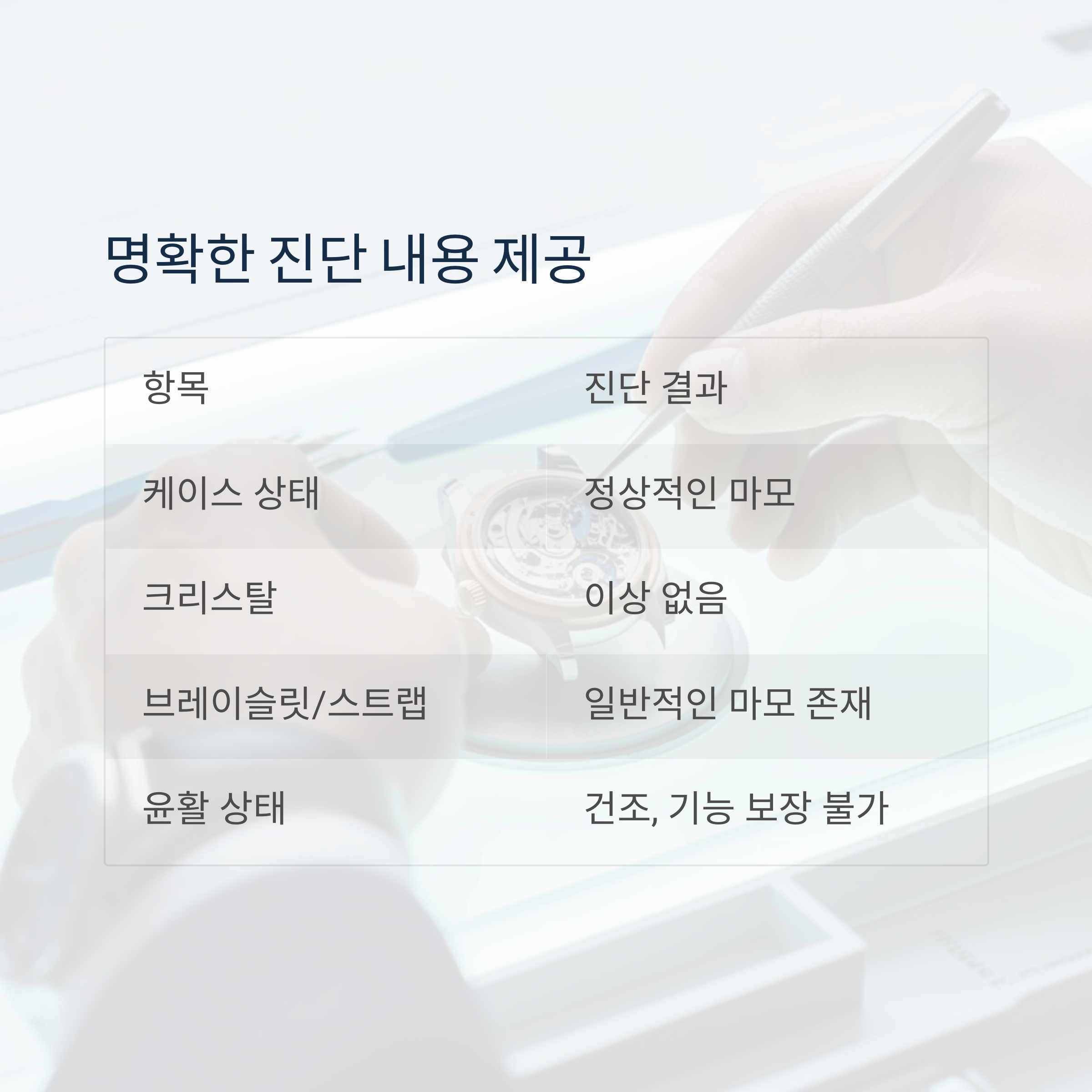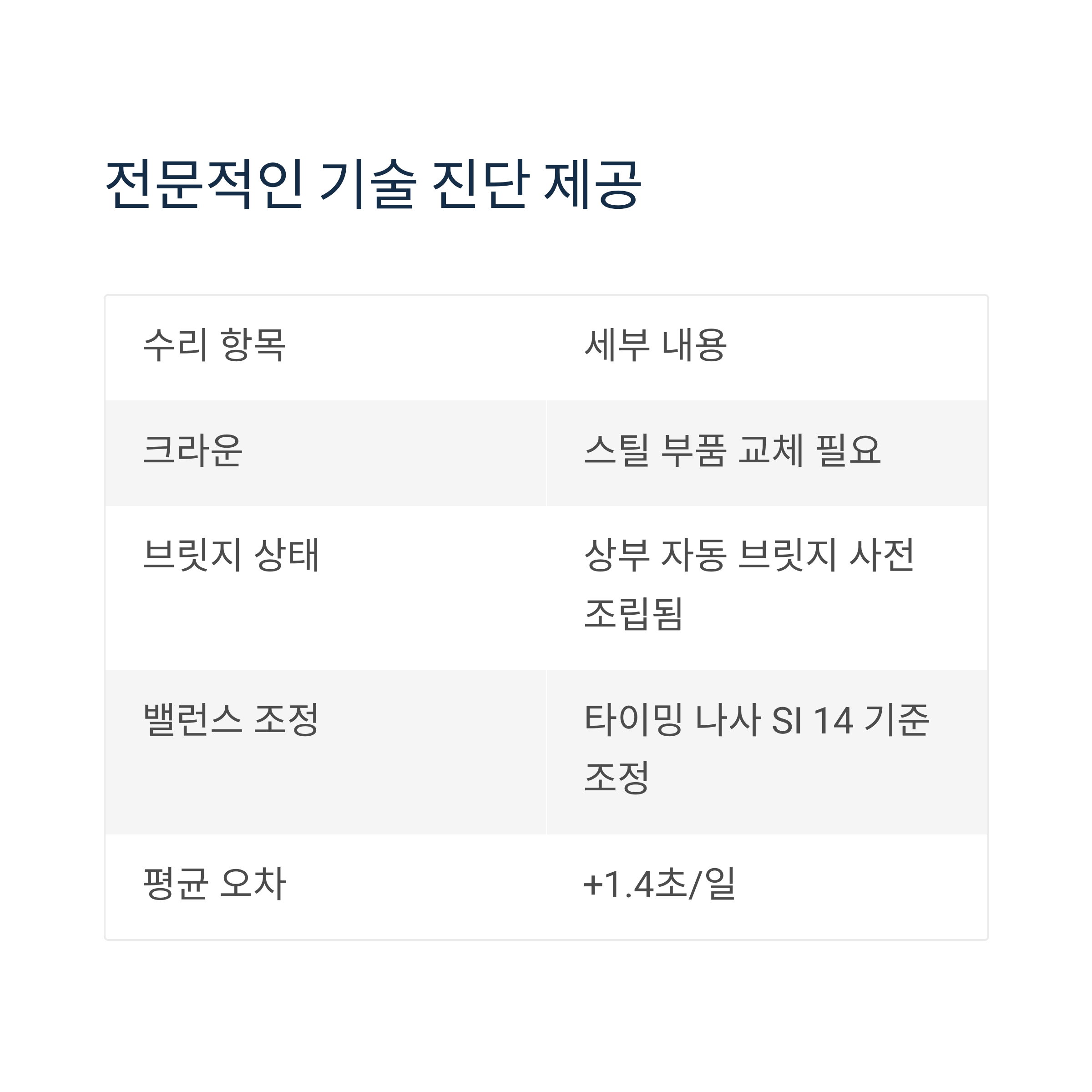 메커니컬 시계에 특화된 전문 진단 내용이 포함되어 있었습니다.