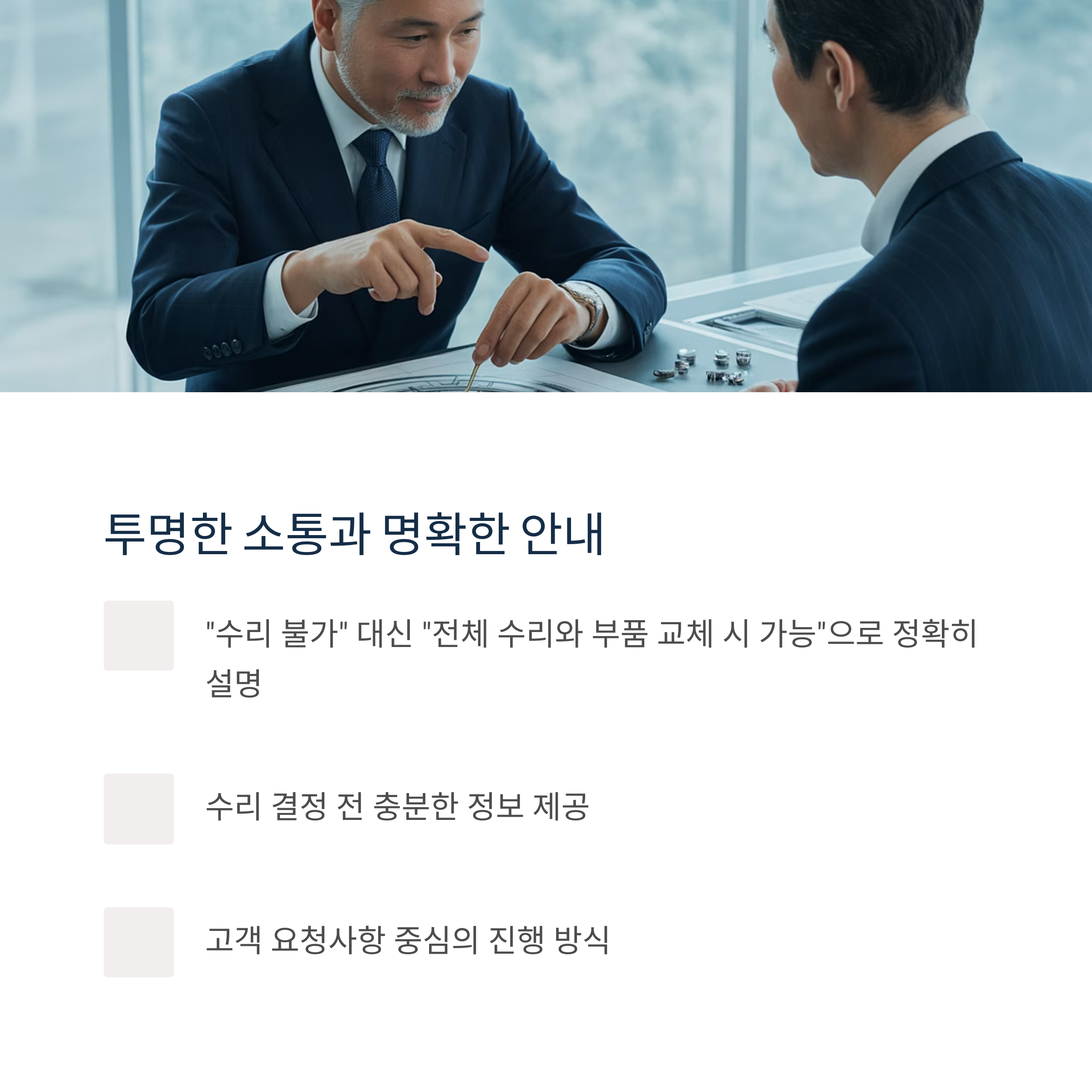 구체적인 수리 내역과 소요 시간, 비용을 상세히 안내받았습니다.