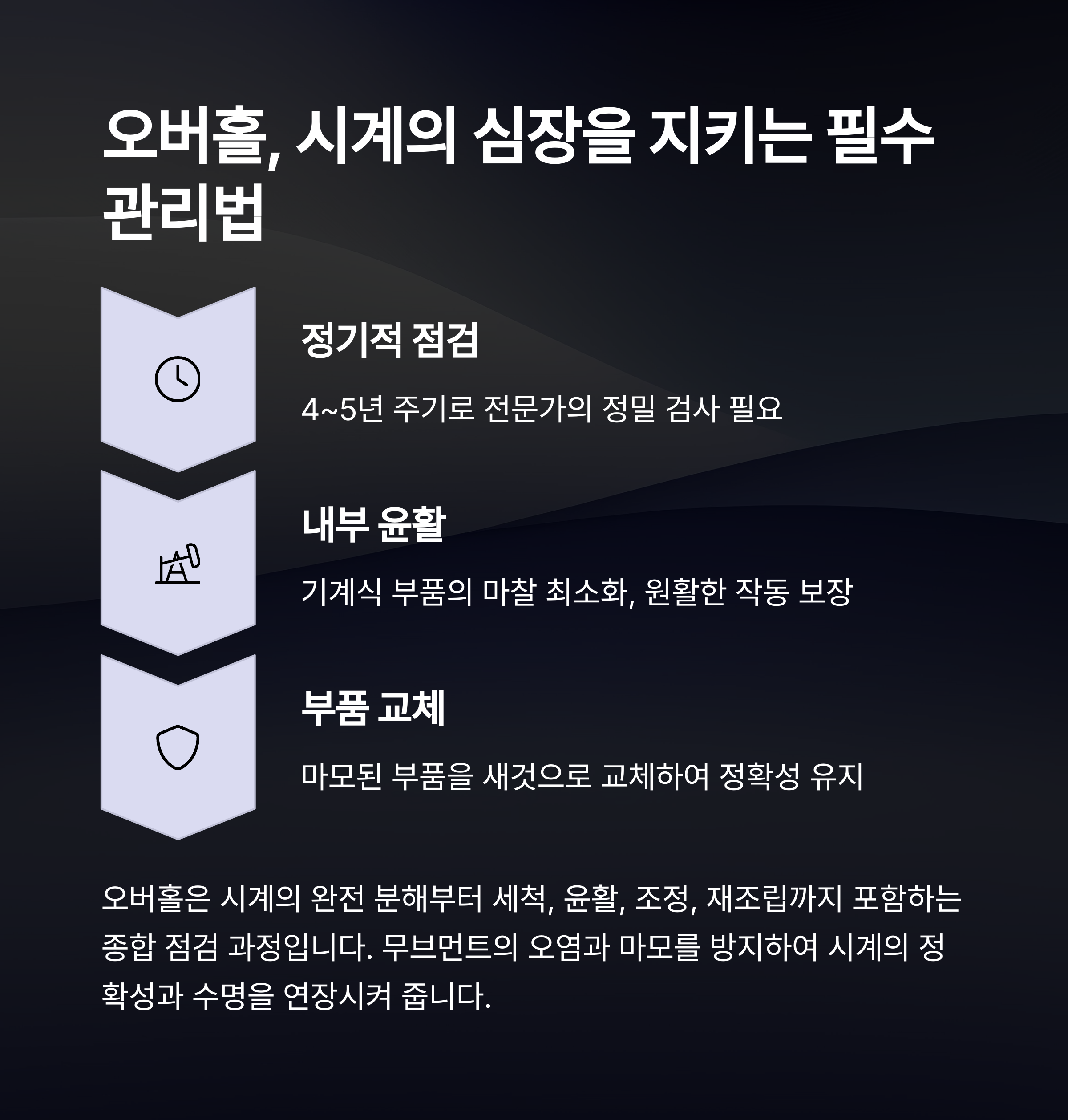 정확성과 내구성을 유지하려면 오버홀이 필수입니다. 기계식 시계는 시간이 지날수록 윤활유가 마르고 부품 마모가 발생하므로 점검이 필요해요.