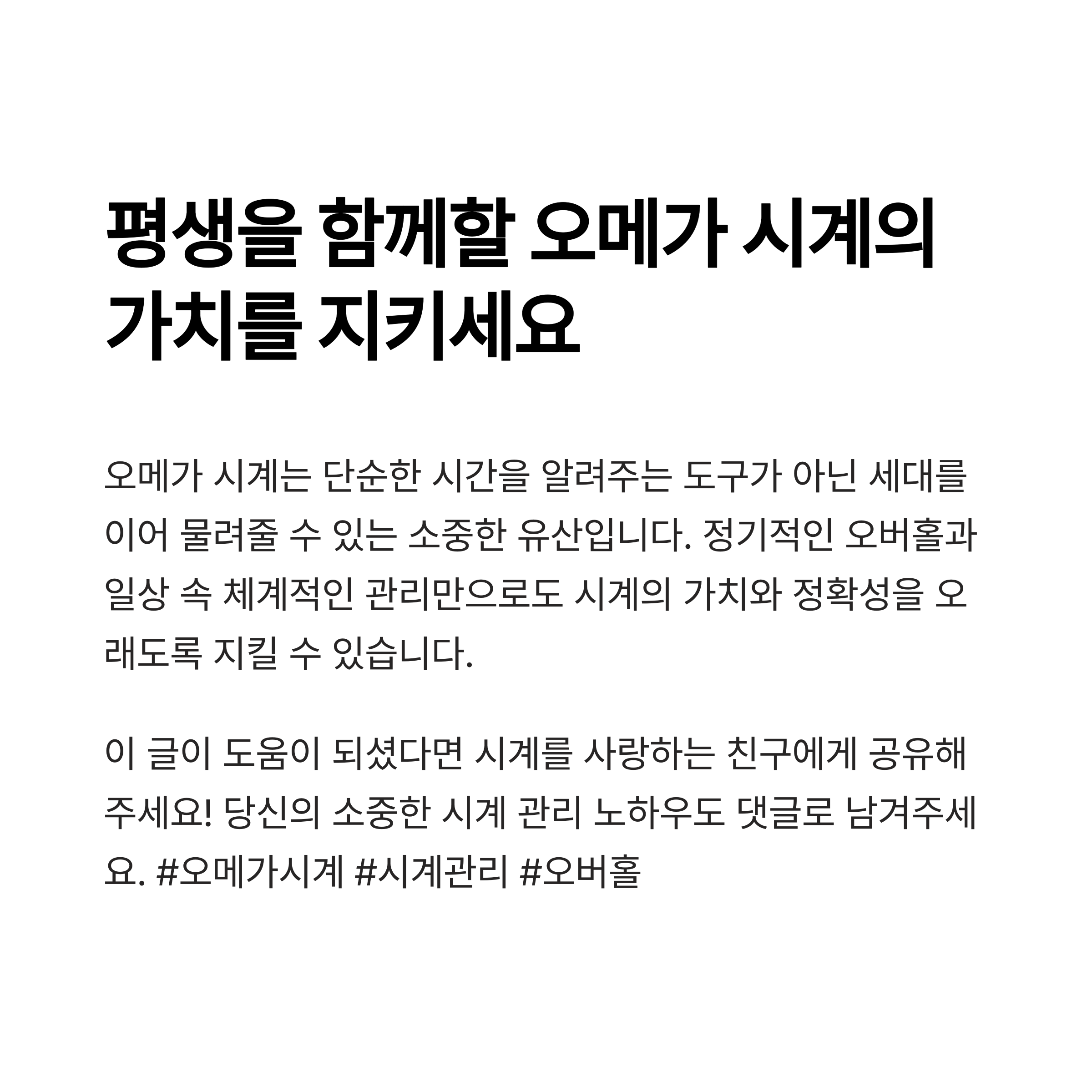 시계는 단순한 악세서리가 아니에요. 시간과 감정을 함께 담는 소중한 존재죠. 오메가 시계도 마찬가지예요. 제대로 관리하면 평생, 아니 그 이상도 함께할 수 있답니다. 이번 글을 통해 여러분도 내 시계를 더 사랑하고, 더 잘 챙겨줄 수 있길 바랍니다. 혹시 오늘 바로 오버홀 예약해볼 생각, 드셨나요?