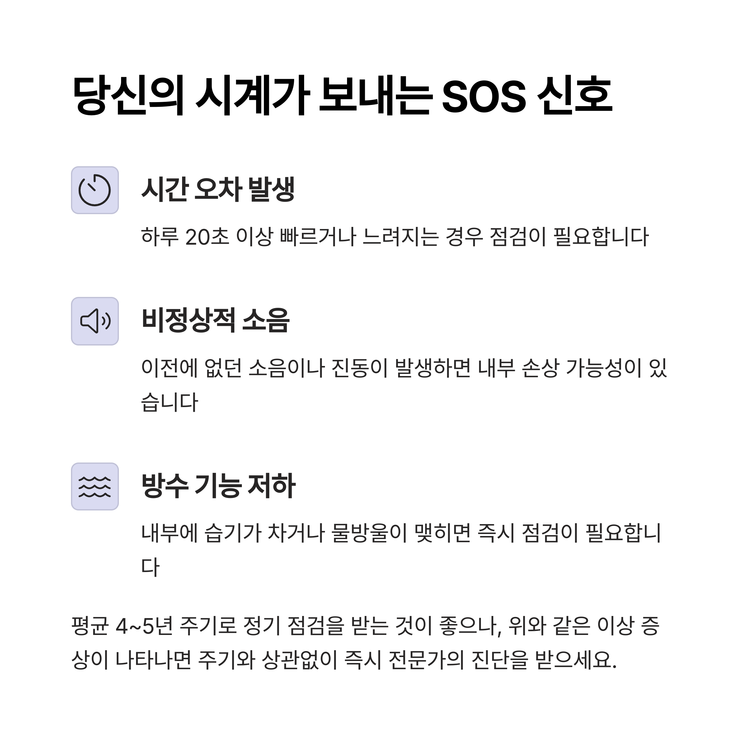 | 소음 발생 | 초침이나 내부 기계에서 이질적인 소리 발생 시 주의 |