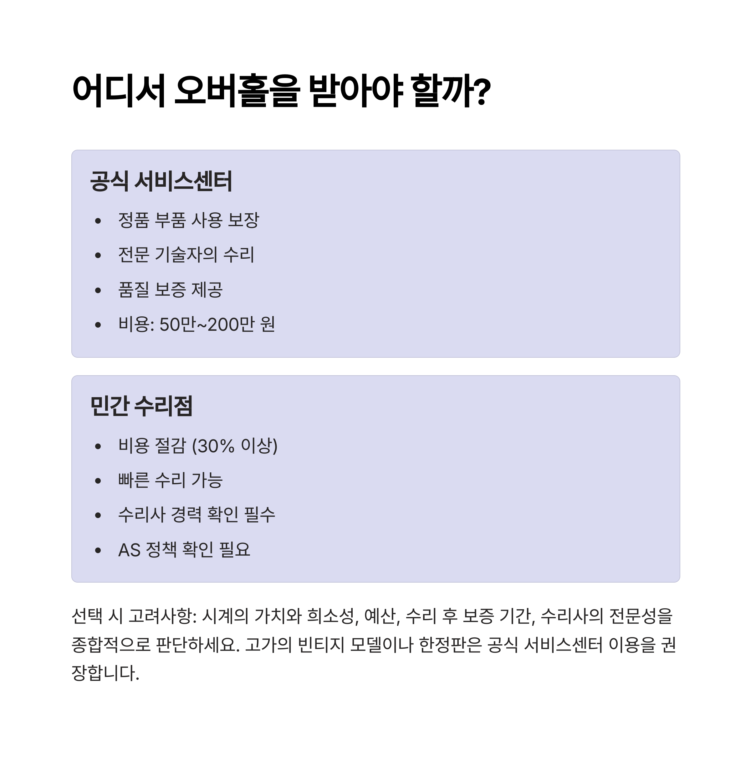 공식 센터에서 오버홀을 받으면 서비스 기록이 브랜드 시스템에 남습니다. 민간 수리점은 별도 수리 증빙을 요청하세요.