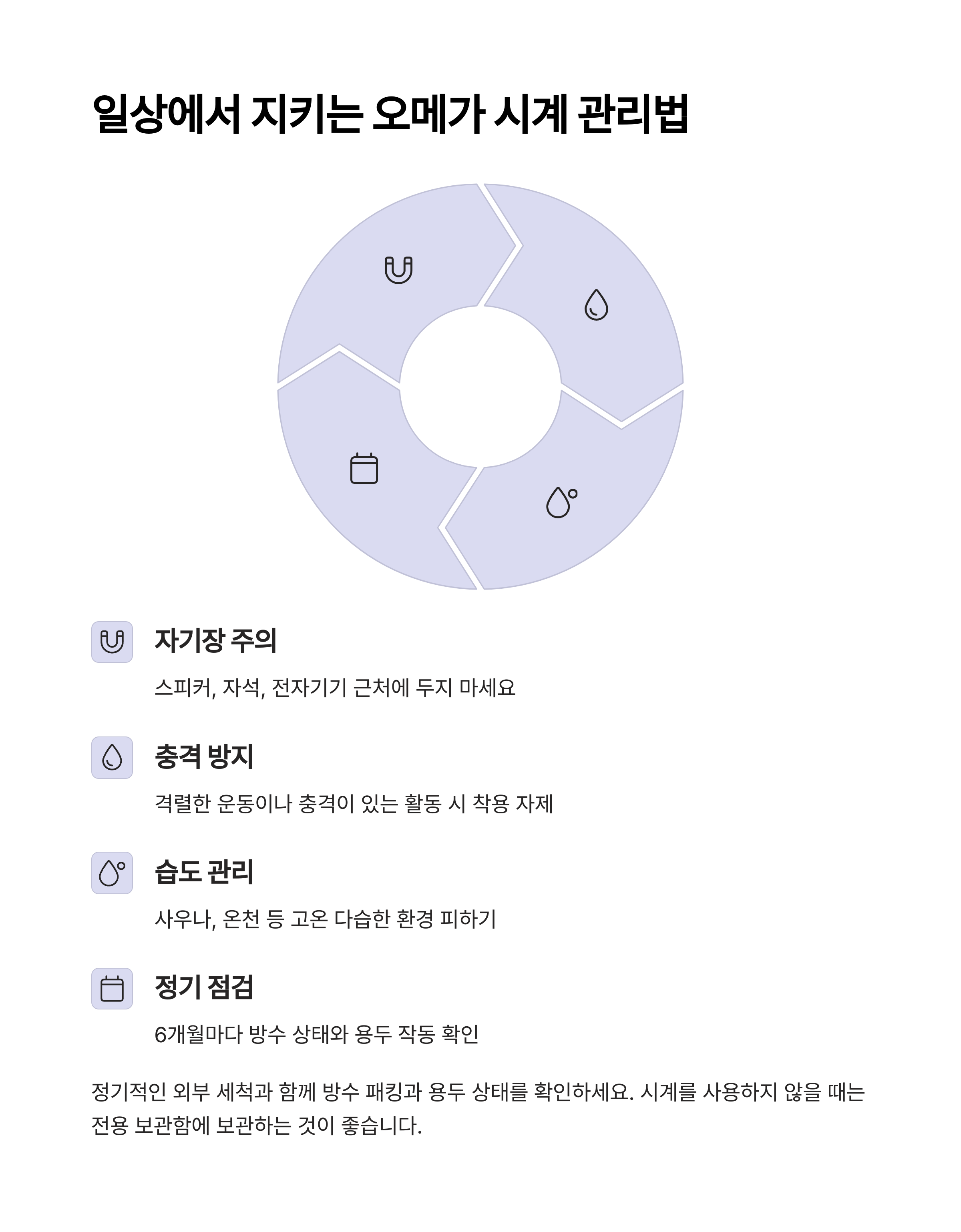 오메가 시계를 평생 친구처럼 오래오래 쓰고 싶다면? 일상 속에서 지켜야 할 관리법을 기억해두세요. 어렵지 않지만 꾸준함이 핵심입니다.