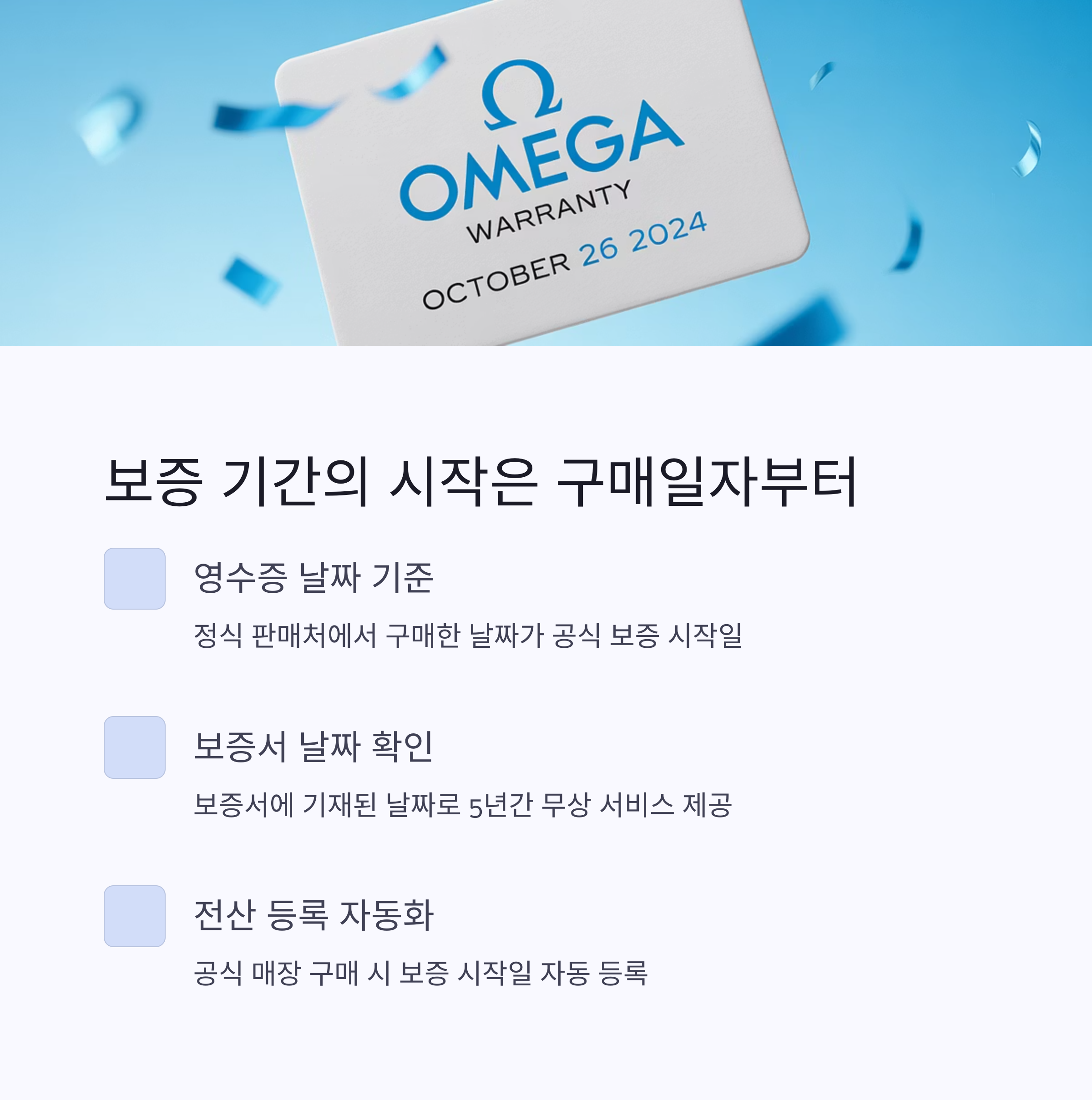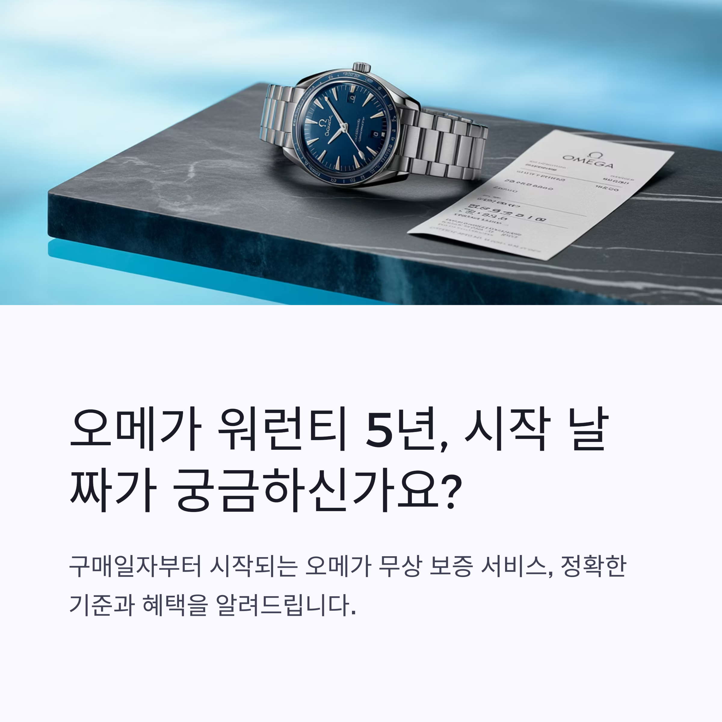 오메가의 5년 무상 보증 서비스는 시계 구매일로부터 시작됩니다.