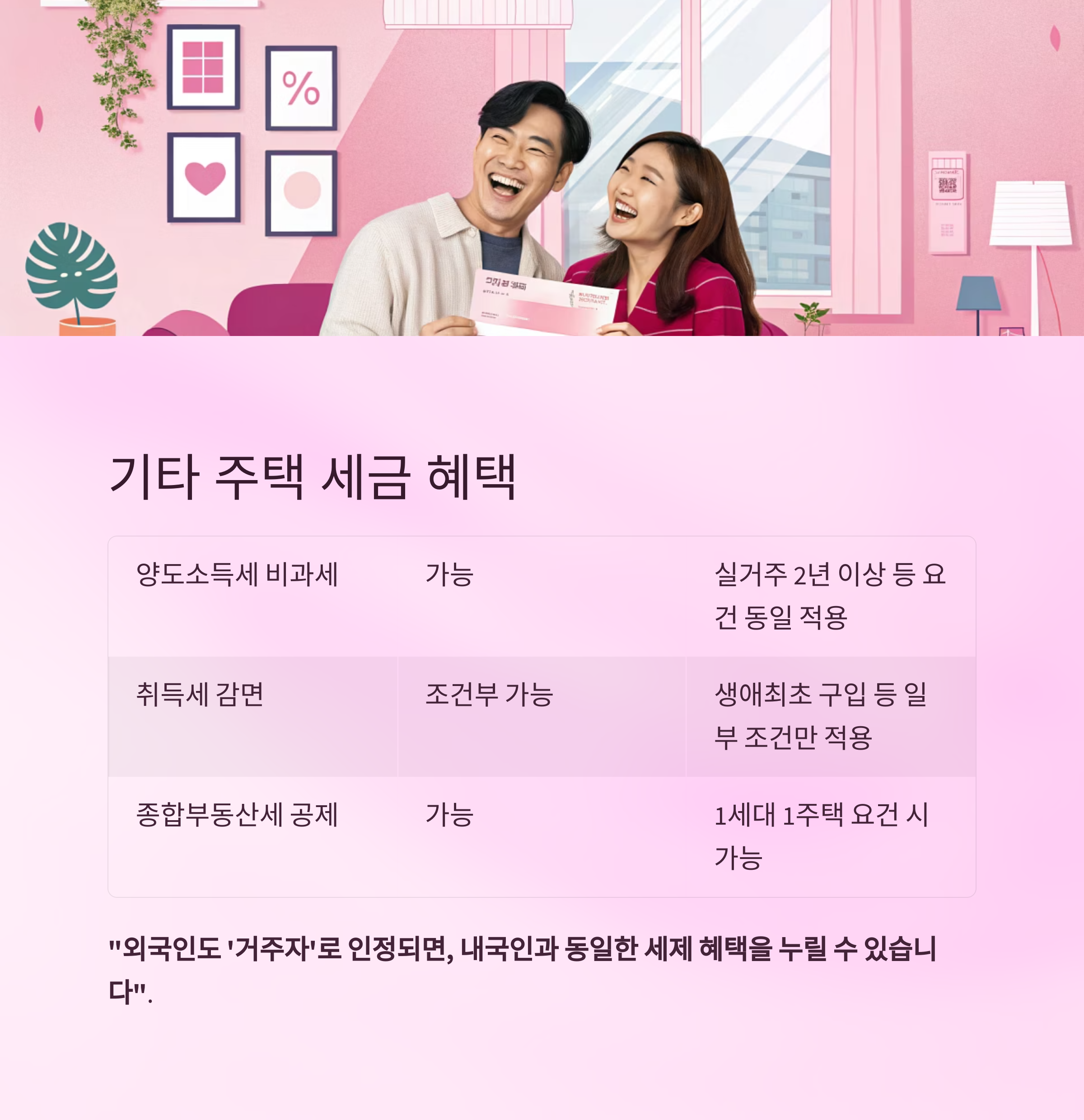 하지만 국내 거주 요건과 주택 취득 요건 등이 명확히 충족돼야 하며, 모든 외국인에게 일괄 적용되는 것은 아닙니다.