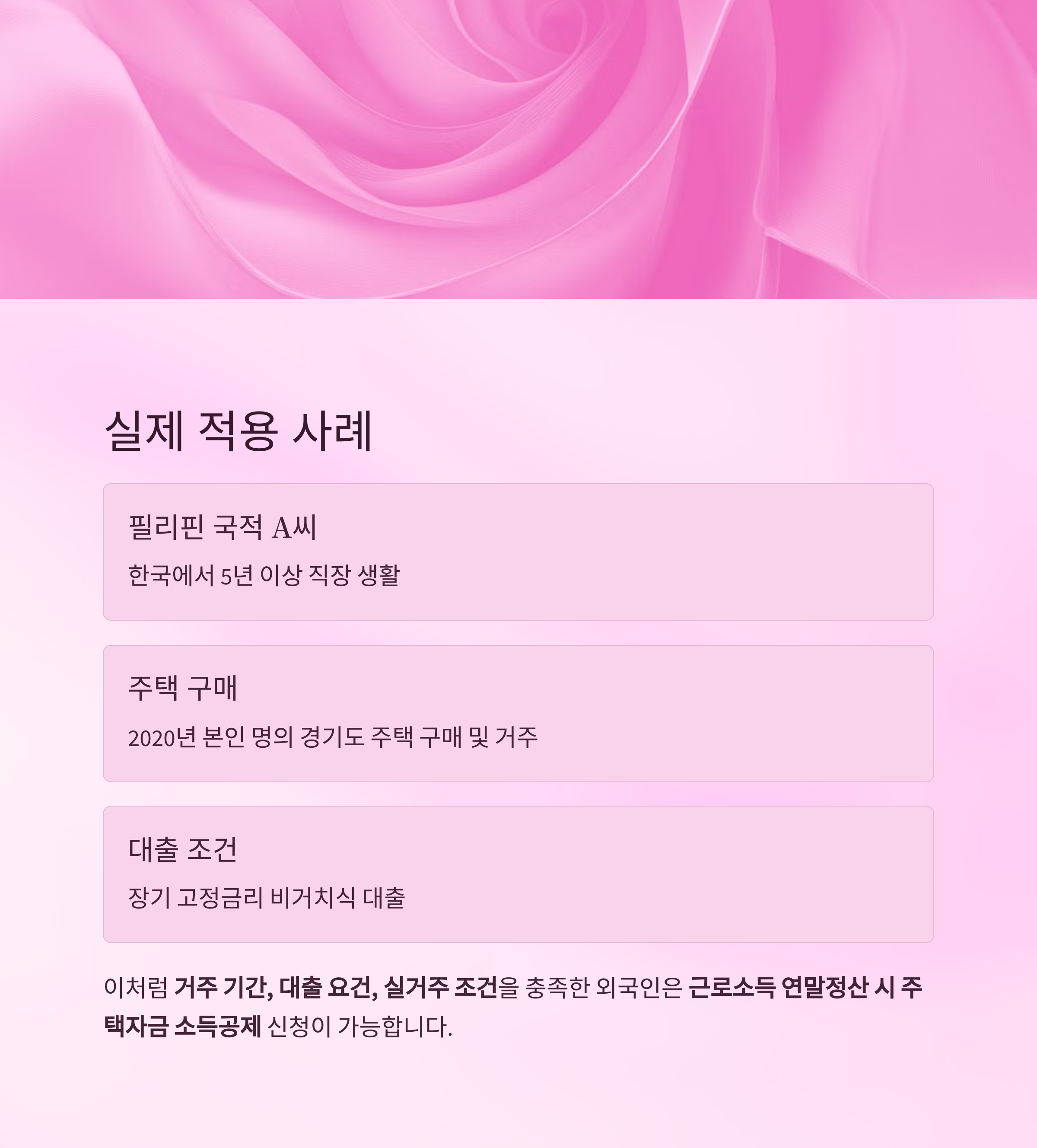 이 사례처럼 거주 기간, 대출 요건, 실거주 조건을 충족한 외국인은 근로소득 연말정산 시 주택자금 소득공제 신청이 가능합니다.