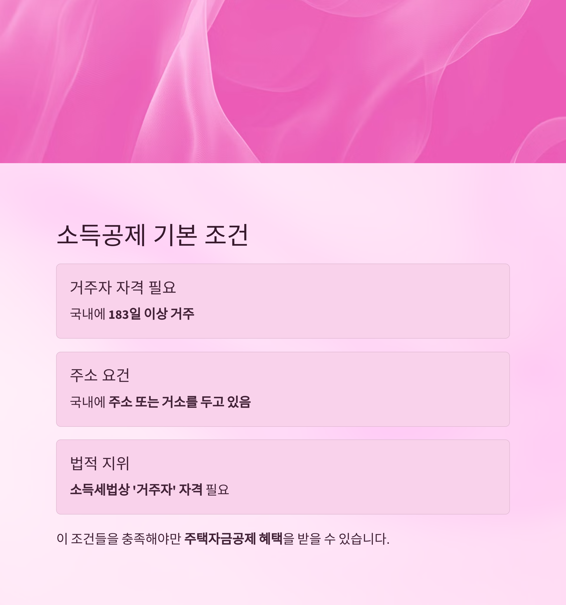 이 조건을 충족해야만 소득세법상 ‘거주자’ 자격이 주어지며, 이에 따라 주택자금공제 혜택을 받을 수 있습니다.