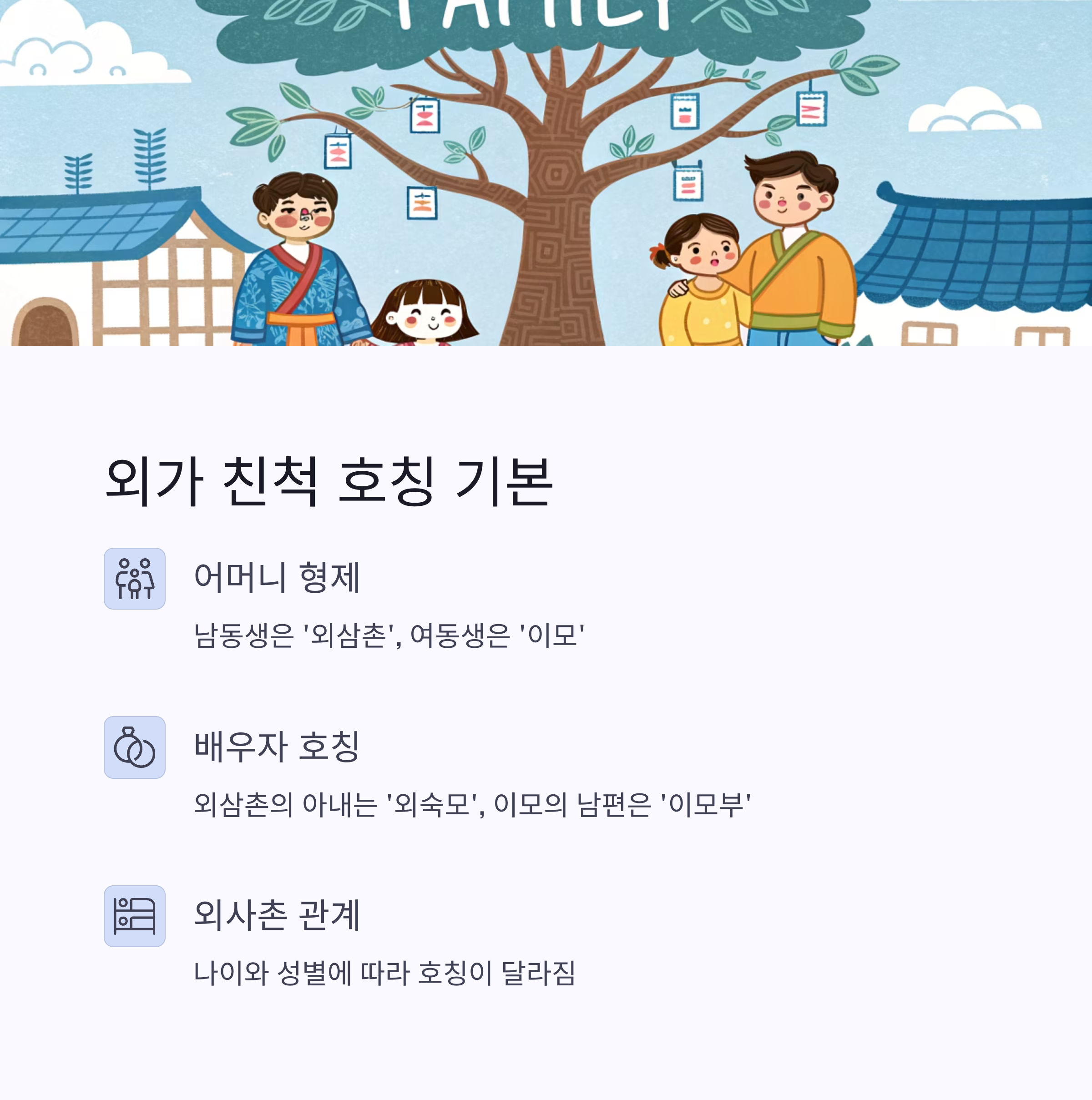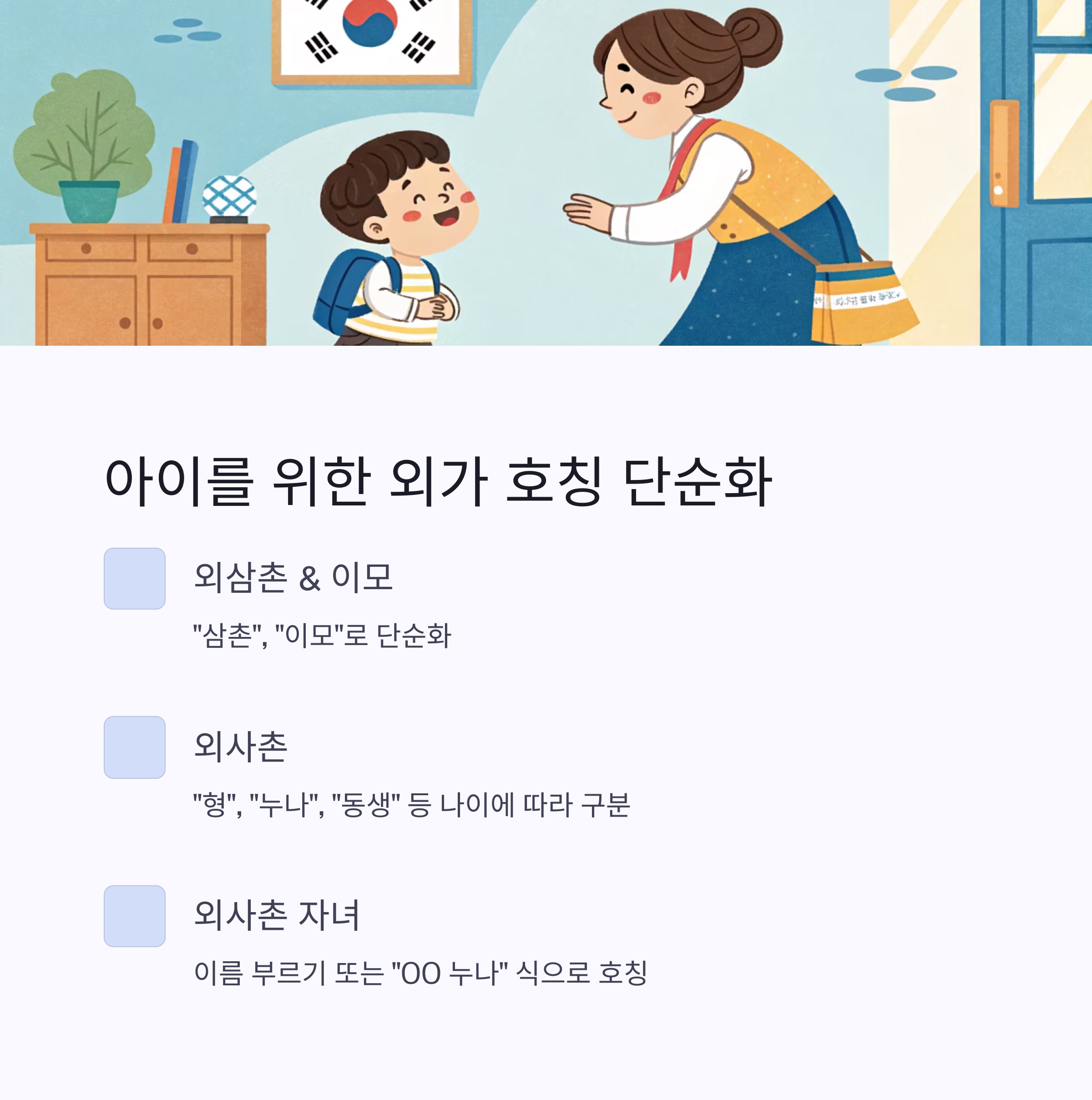 외가 친척을 아이가 부를 때는 복잡한 호칭보다는 아이 눈높이에 맞춘 단순한 방식이 좋아요. 아래 리스트처럼 정리해두면 아이가 익히기 훨씬 쉬워집니다.