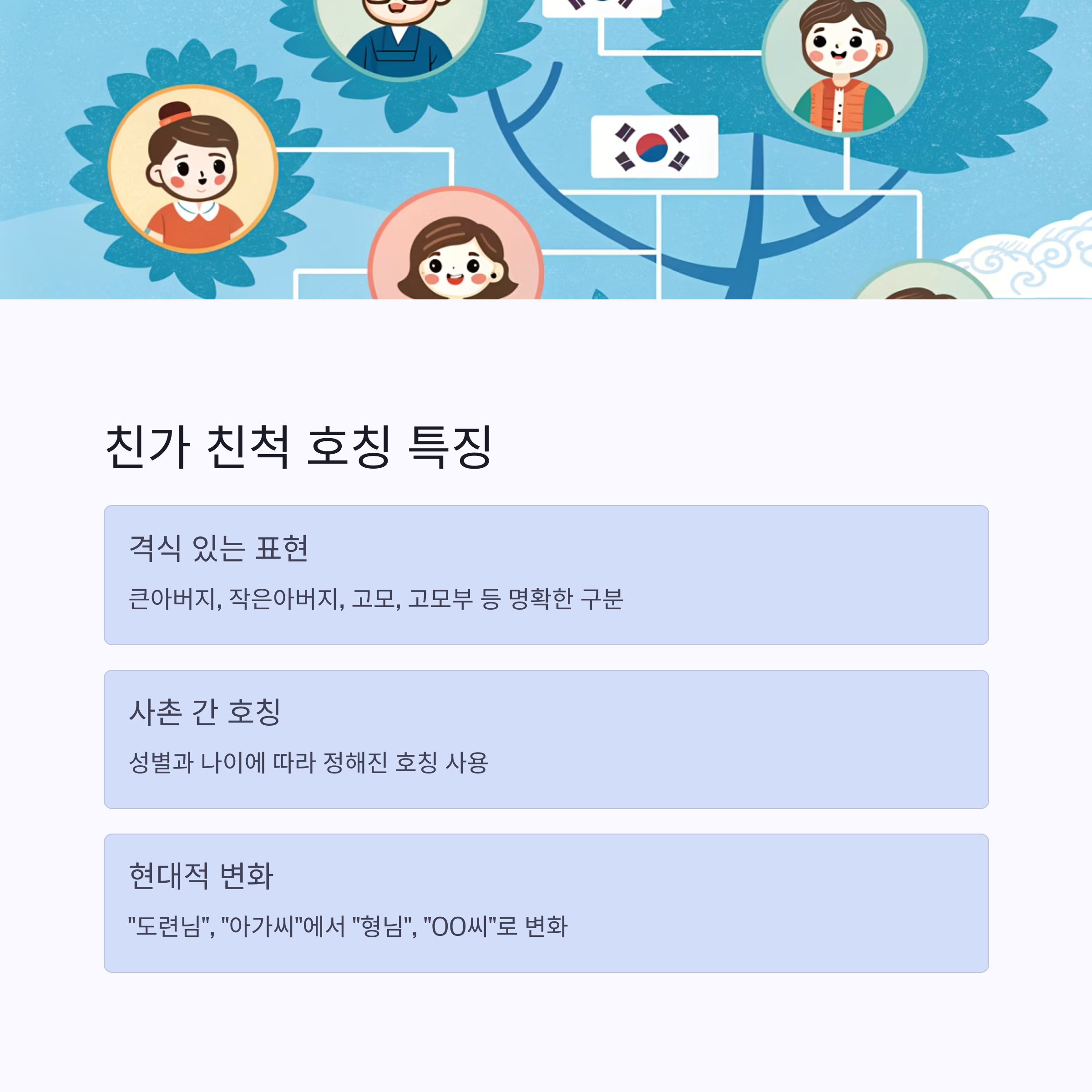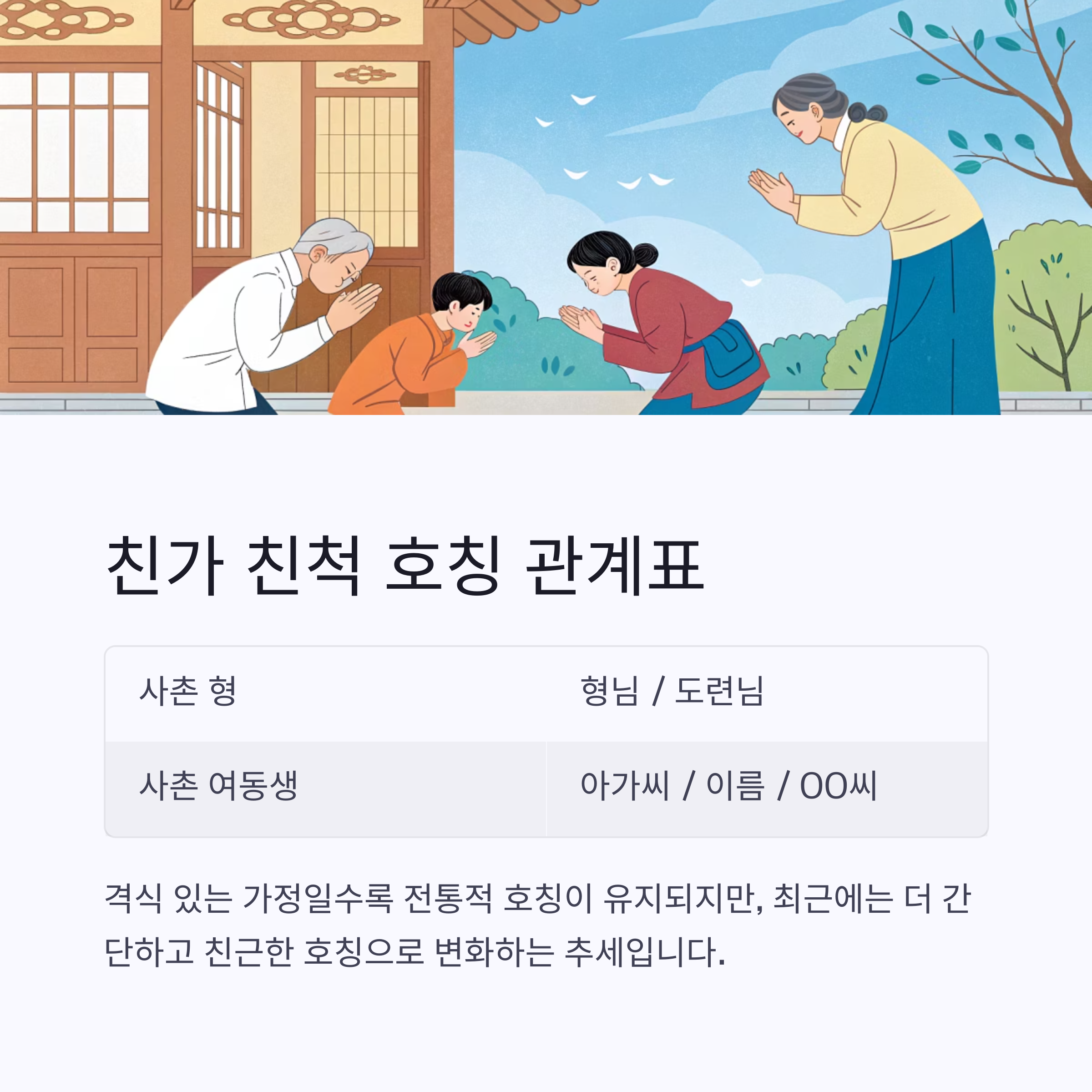 친가, 즉 아버지 쪽 친척 호칭은 예전부터 더 격식 있는 표현이 많았죠. 큰아버지, 작은아버지, 고모, 고모부 같은 호칭은 명확히 구분되어야 하고, 사촌 간에도 성별과 나이에 따라 부르는 말이 정해져 있는 경우가 많아요. 예전에는 "도련님", "아가씨" 같은 표현을 많이 썼는데, 요즘은 좀 더 부드럽게 “형님”, “OO씨”로 바뀌어가는 분위기입니다.