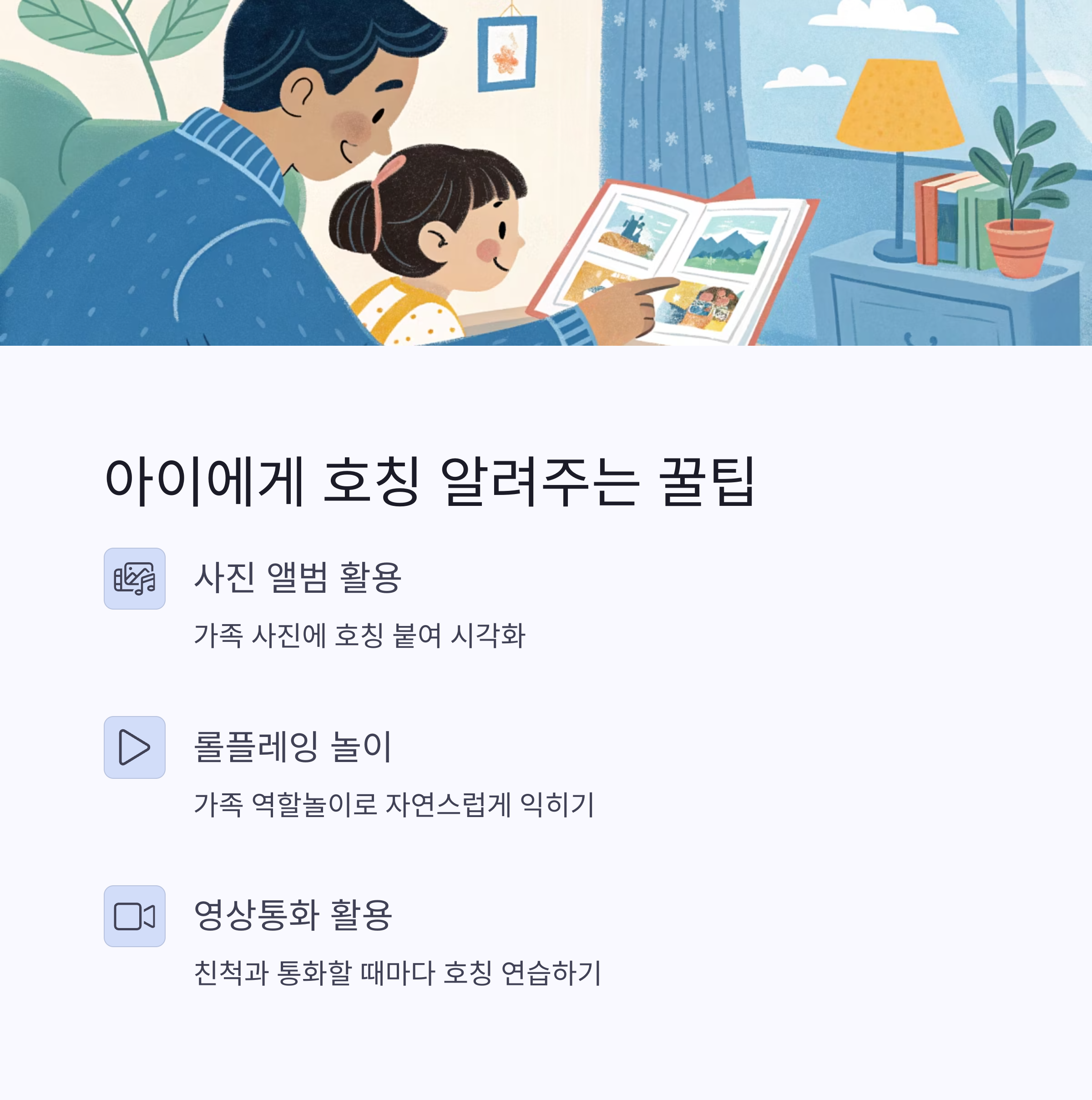 아이에게 복잡한 친척 호칭을 가르칠 때는 아래 리스트처럼 실생활에서 활용할 수 있는 팁을 적용해보세요. 억지로 외우게 하기보단, 자연스럽게 익히도록 돕는 게 핵심이에요.