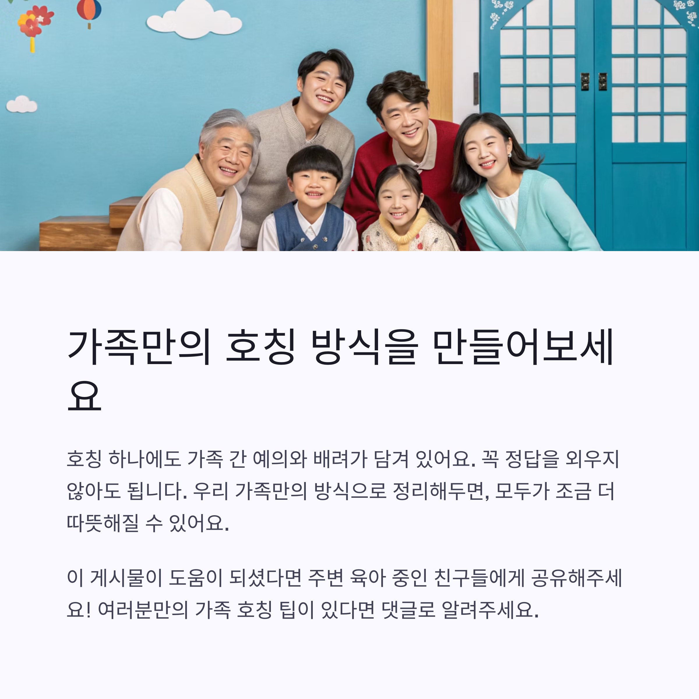 호칭 하나에도 가족 간 예의와 배려가 담겨 있다는 사실, 새삼 느끼게 되죠. 저도 처음엔 "도대체 왜 이렇게 복잡한 거야?" 하고 투덜댔지만, 지금은 아이가 자연스럽게 “이모야~”, “삼촌!” 하고 부를 때마다 참 뿌듯합니다. 꼭 정답을 외우지 않아도 돼요. 우리 가족만의 방식으로 정리해두면, 모두가 조금 더 따뜻해질 수 있어요. 혹시 여러분도 이 글 보면서 한 사람씩 떠올리셨나요? 그럼 오늘 저녁, 가족과 함께 작은 호칭 정리 한번 해보시는 건 어떨까요?