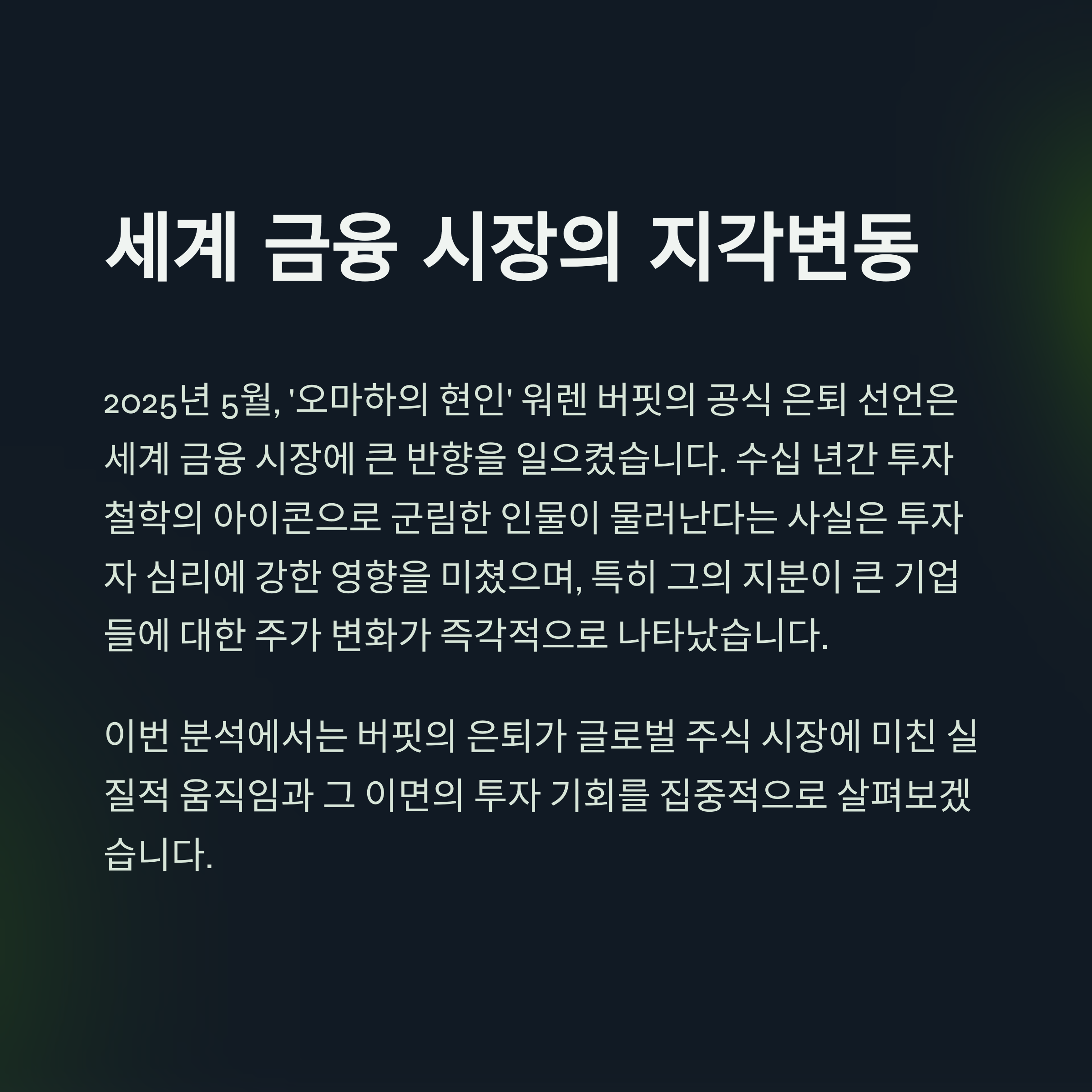 이 글에서는 버핏의 은퇴가 글로벌 주식 시장에 미친 실질적 움직임과 그 이면의 투자 기회를 집중 분석합니다.