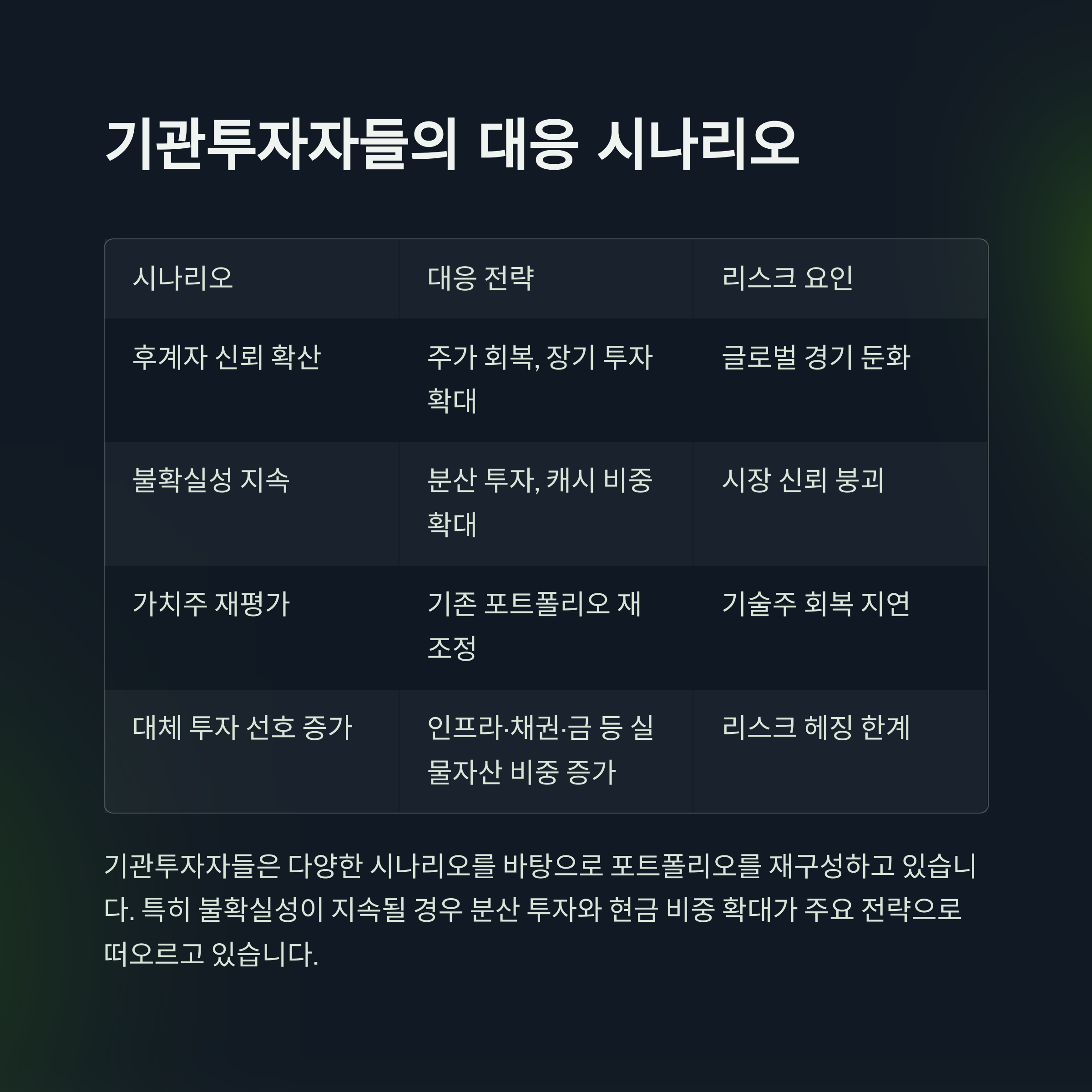 | 불확실성 지속 | 분산 투자, 캐시 비중 확대 | 시장 신뢰 붕괴 |