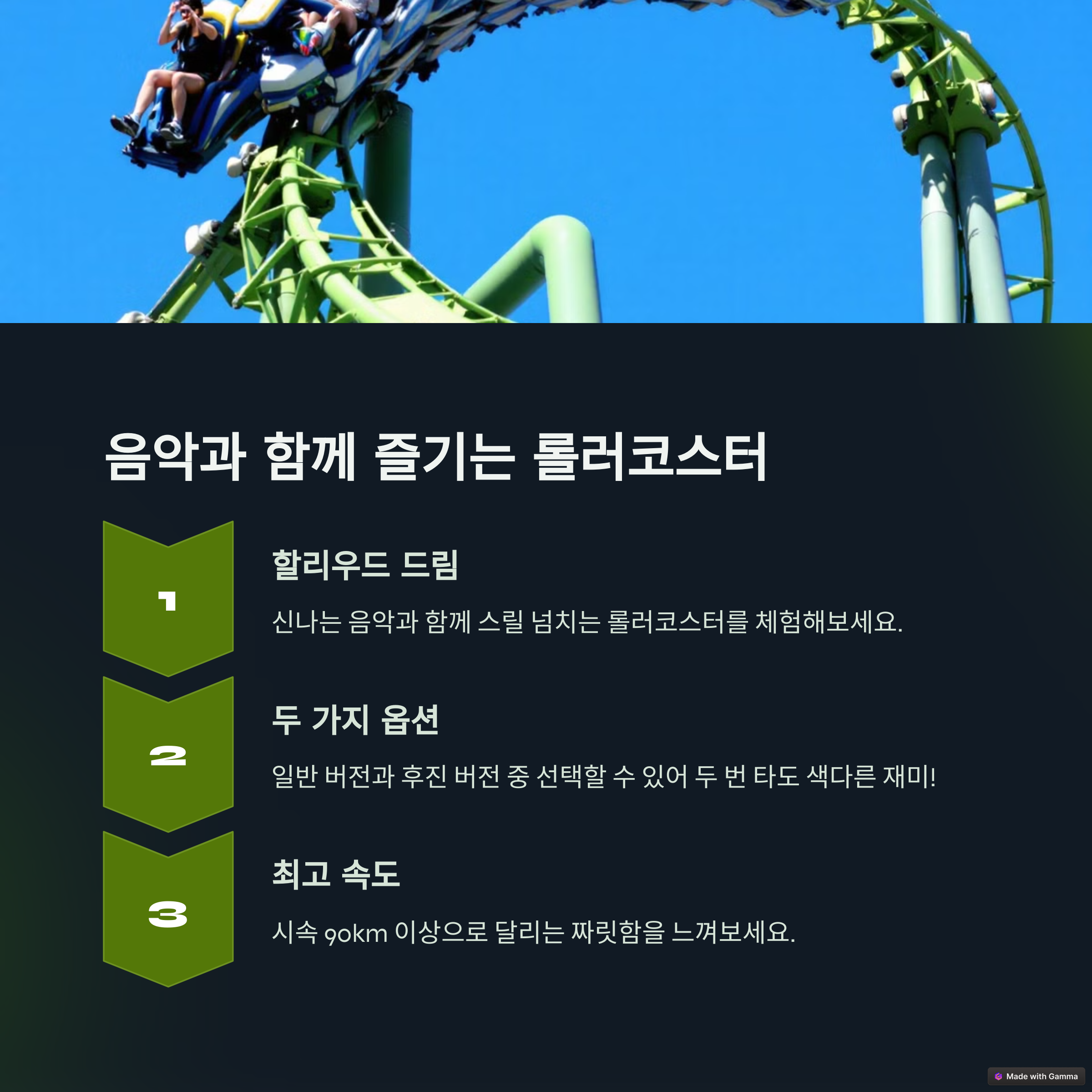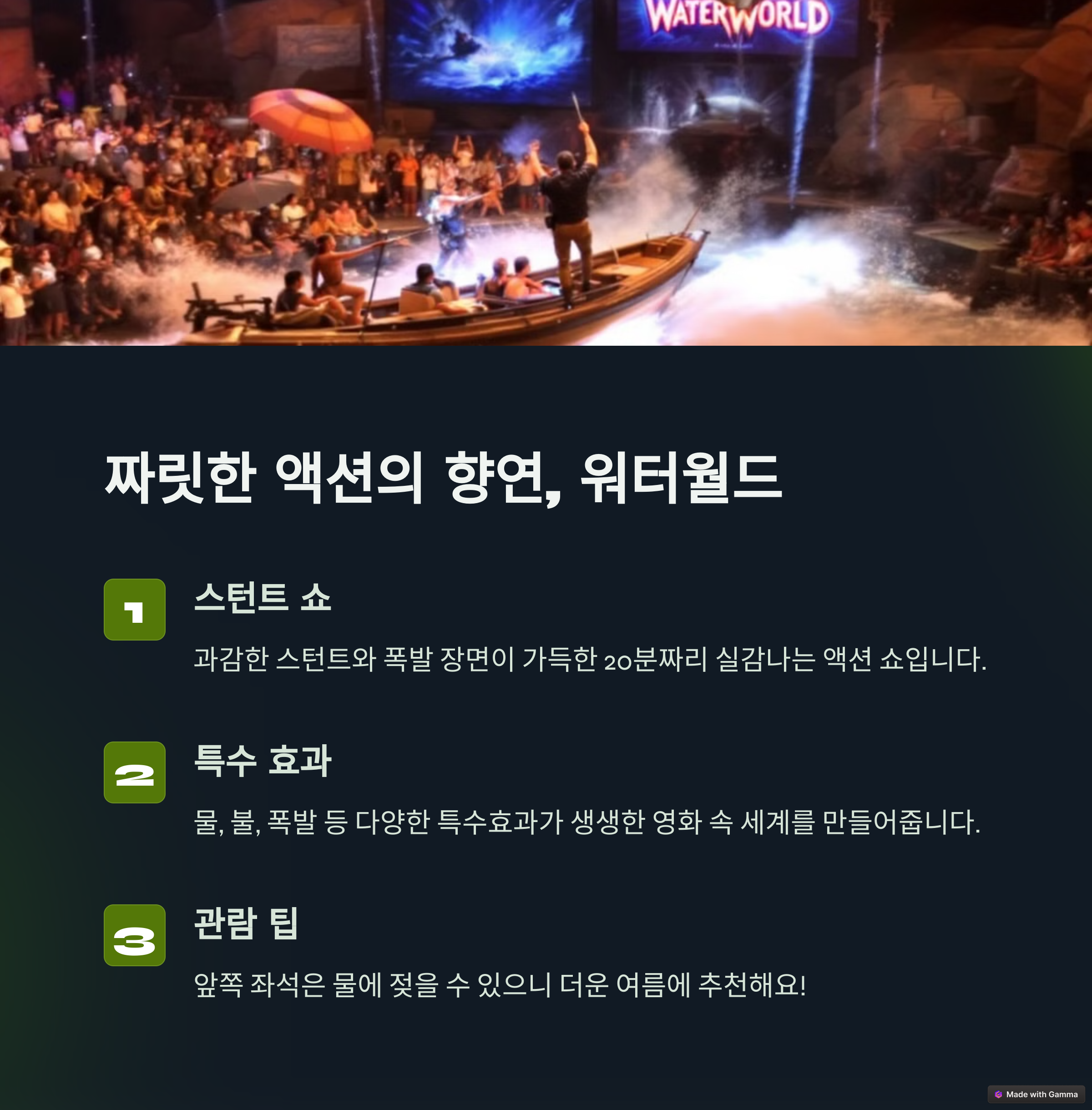 워터월드는 과감한 스턴트와 특수효과가 돋보이는 20분짜리 쇼입니다. 이 쇼는 매력적인 액션과 뛰어난 시각적 효과로 관객들에게 큰 인기를 끌고 있습니다. 뿐만 아니라, 할리우드 드림 – 더 라이드는 음악과 함께 즐길 수 있는 롤러코스터로, 특히 후진 버전으로 또 다른 재미를 느낄 수 있습니다. 이와 같은 놀이기구들은 어드벤처와 스릴을 동시에 즐기고 싶은 사람들에게 최고의 선택이 될 것입니다.