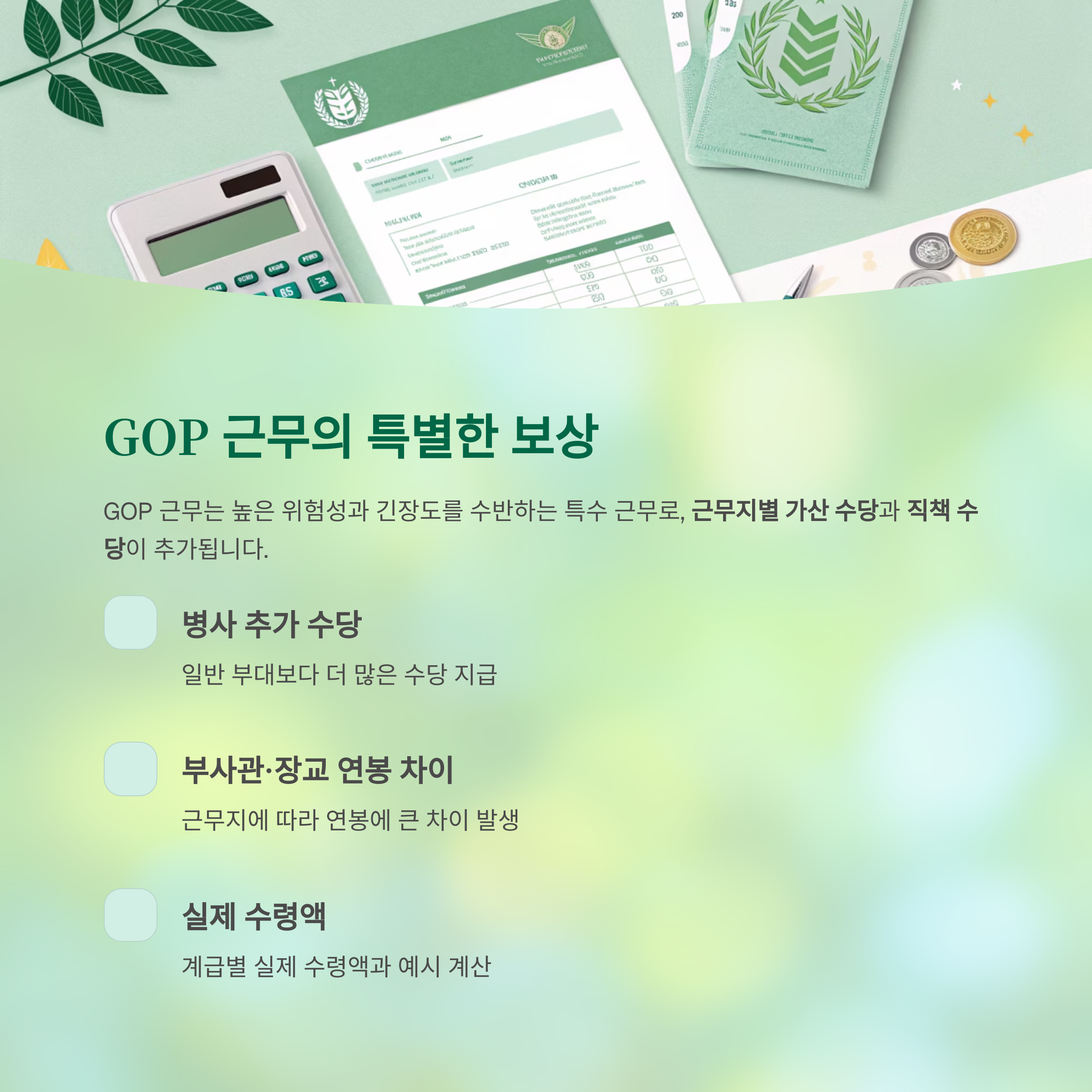 본 글에서는 GOP 근무 병사 수당, 부사관·장교 연봉 체계,