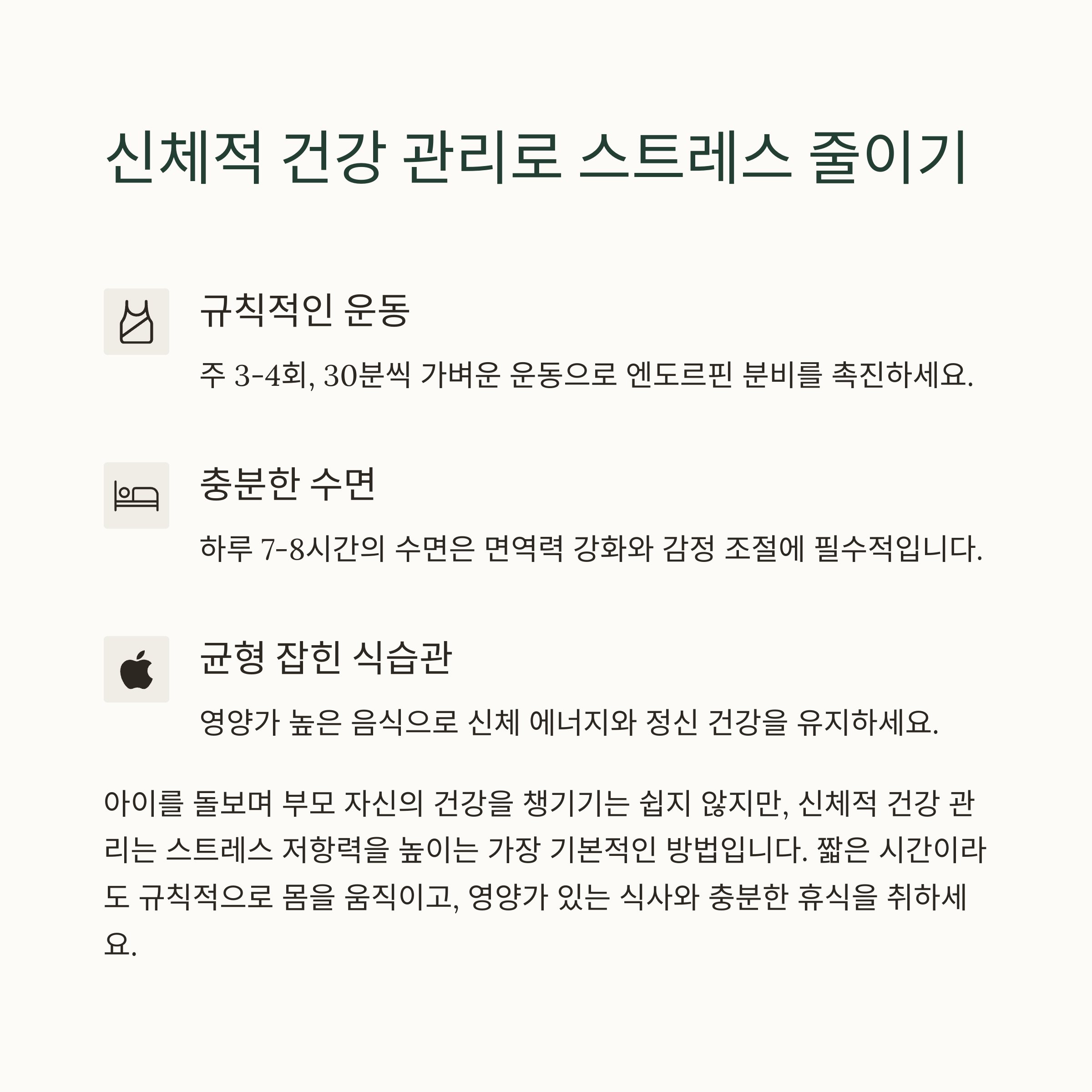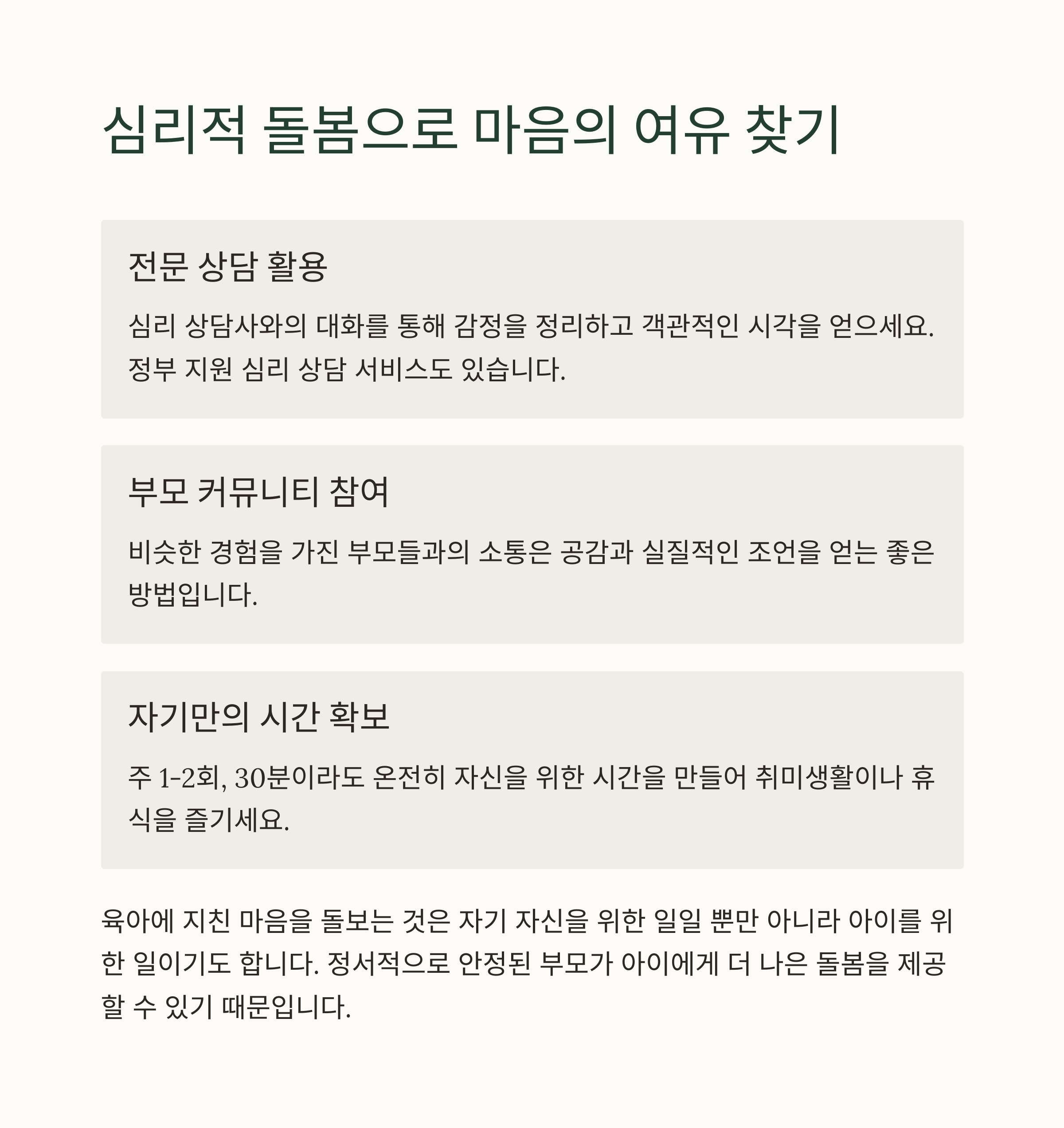 운동, 취미, 소통 등 자기 회복의 전략은 개인적 행복과 육아의 질을 모두 높여줍니다.