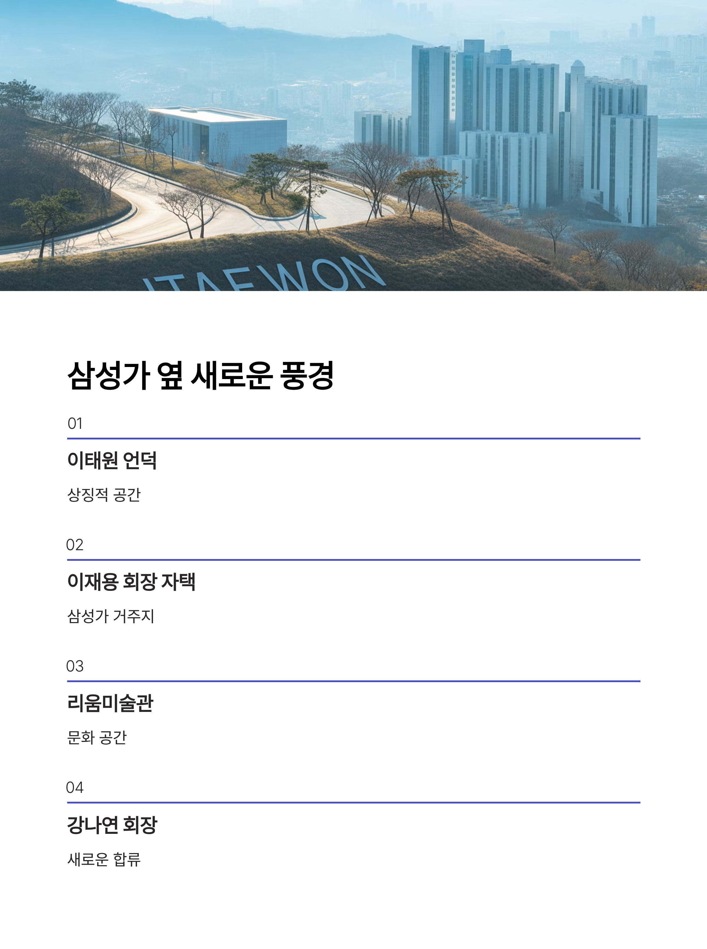 이태원 언덕 위, 이재용 회장의 자택과 리움미술관이 자리한 곳에 강 회장이 합류했습니다. 삼성가의 상징적 공간 옆에서 새로운 주인이 들어온 풍경은, 한국 재계의 과거와 현재, 그리고 미래가 교차하는 장면으로 상징성을 더합니다.