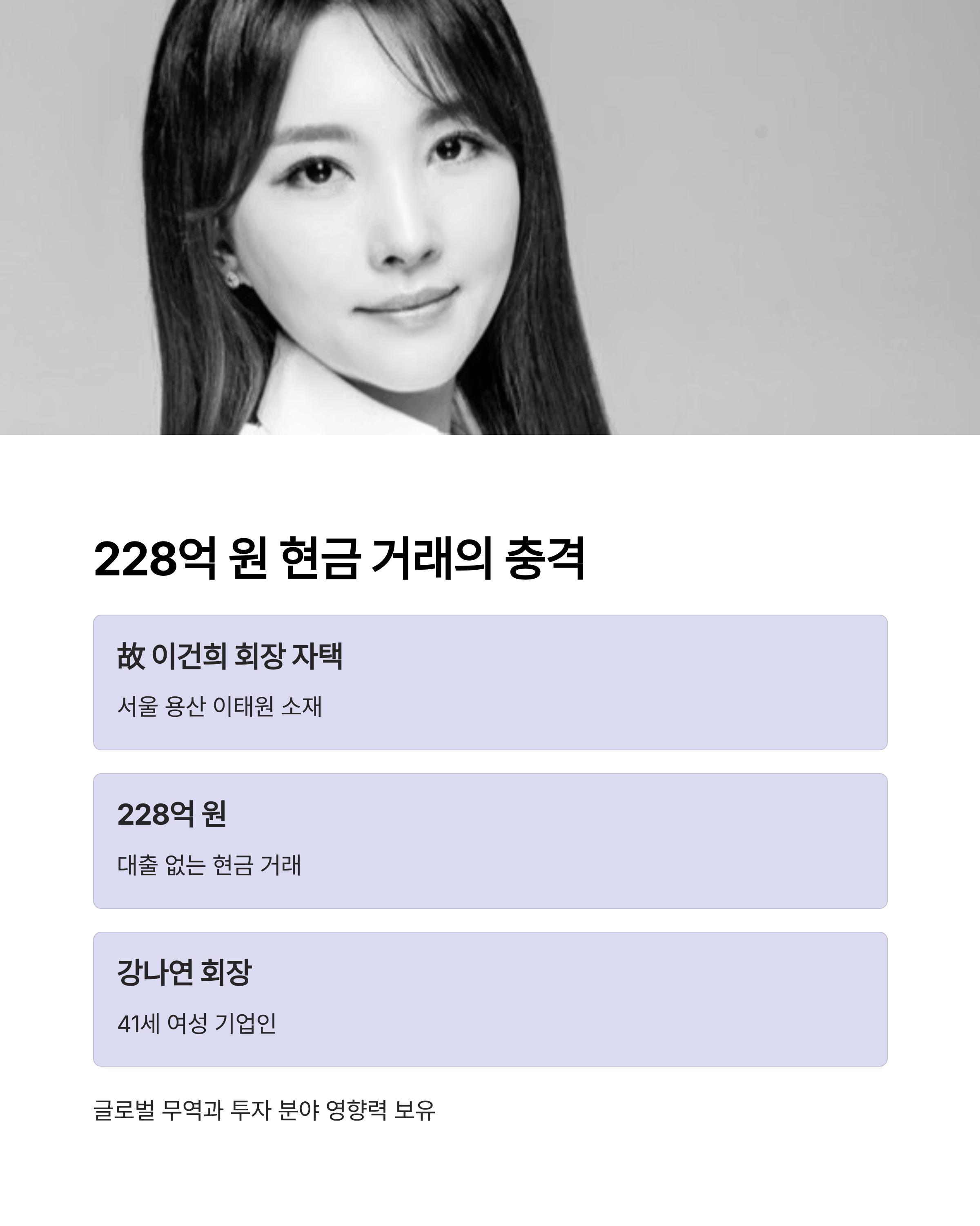 故 이건희 삼성전자 회장이 거주했던 서울 용산 이태원 자택이 최근 228억 원에 매각되며 큰 관심을 모았습니다. 더 놀라운 사실은 단 한 푼의 대출도 없이 현금으로 거래가 이뤄졌다는 점입니다. 이 집의 새로운 주인은 올해 41세의 여성 기업인, 강나연 태화홀딩스 회장입니다. 낯선 이름 같지만, 업계에서는 이미 글로벌 무역과 투자 분야에서 영향력을 보여온 인물입니다. 이번 선택은 단순한 자산 매입을 넘어 한국 재계의 흐름을 보여주는 중요한 장면으로 읽힙니다.