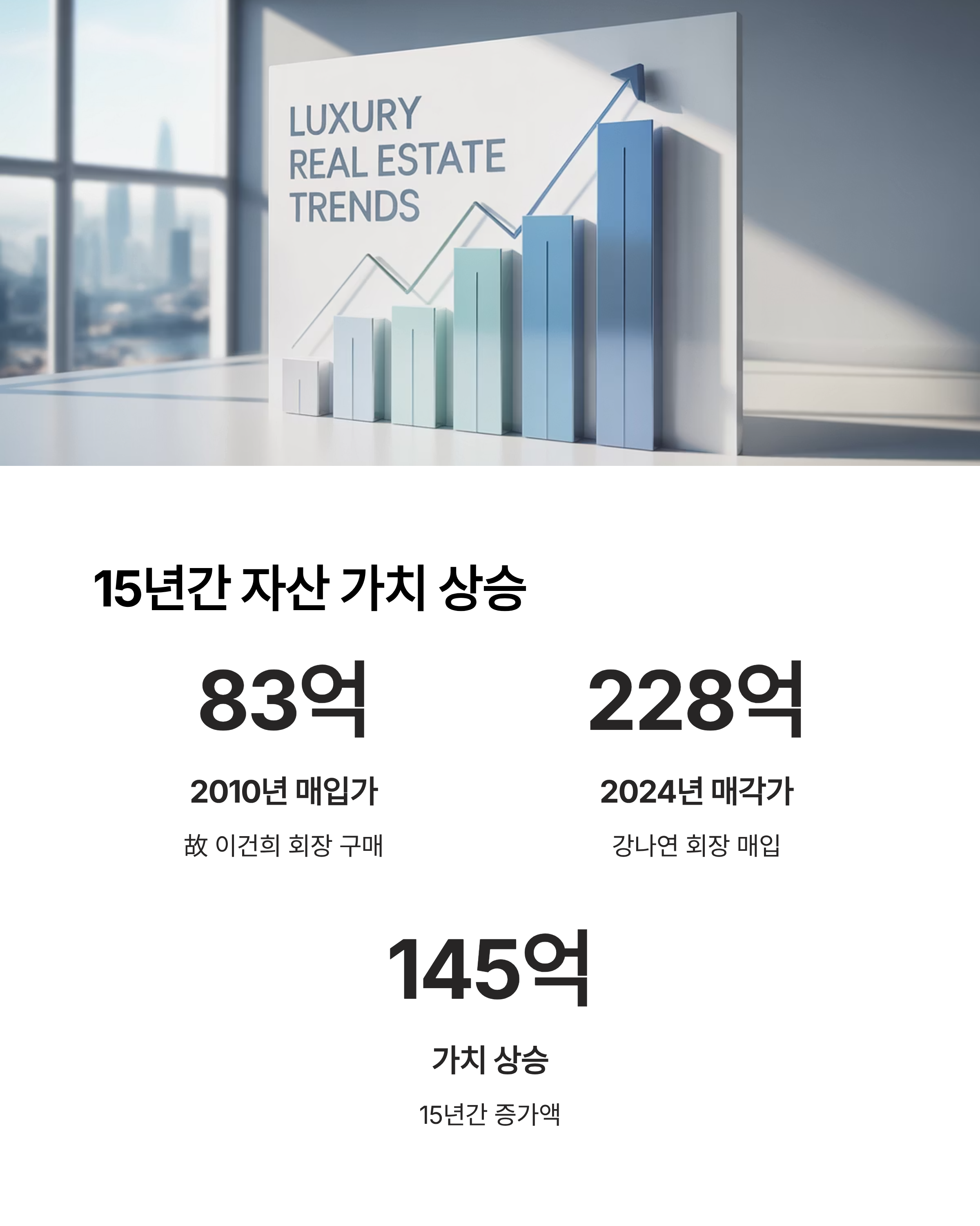 故 이건희 회장이 2010년 82억 8000만 원에 매입한 자택은 15년 만에 228억 원으로 거래되었습니다. 단순히 금액의 차이를 넘어, 자산의 상징성과 시간의 흐름이 함께 담긴 결과라 할 수 있습니다.