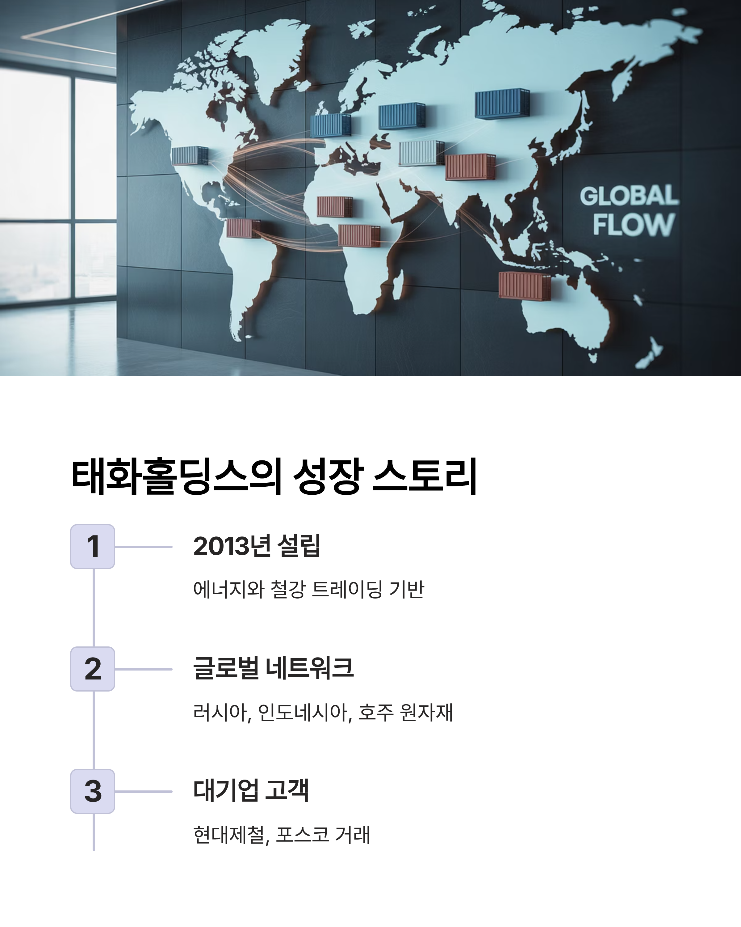 2013년 설립된 태화홀딩스는 에너지와 철강 트레이딩을 기반으로 성장했습니다. 러시아, 인도네시아, 호주 등지에서 원자재를 들여와 아시아 시장에 공급하며 글로벌 네트워크를 구축했지요. 현대제철, 포스코와 같은 대기업을 고객사로 두면서 시장에서 입지를 공고히 했습니다.