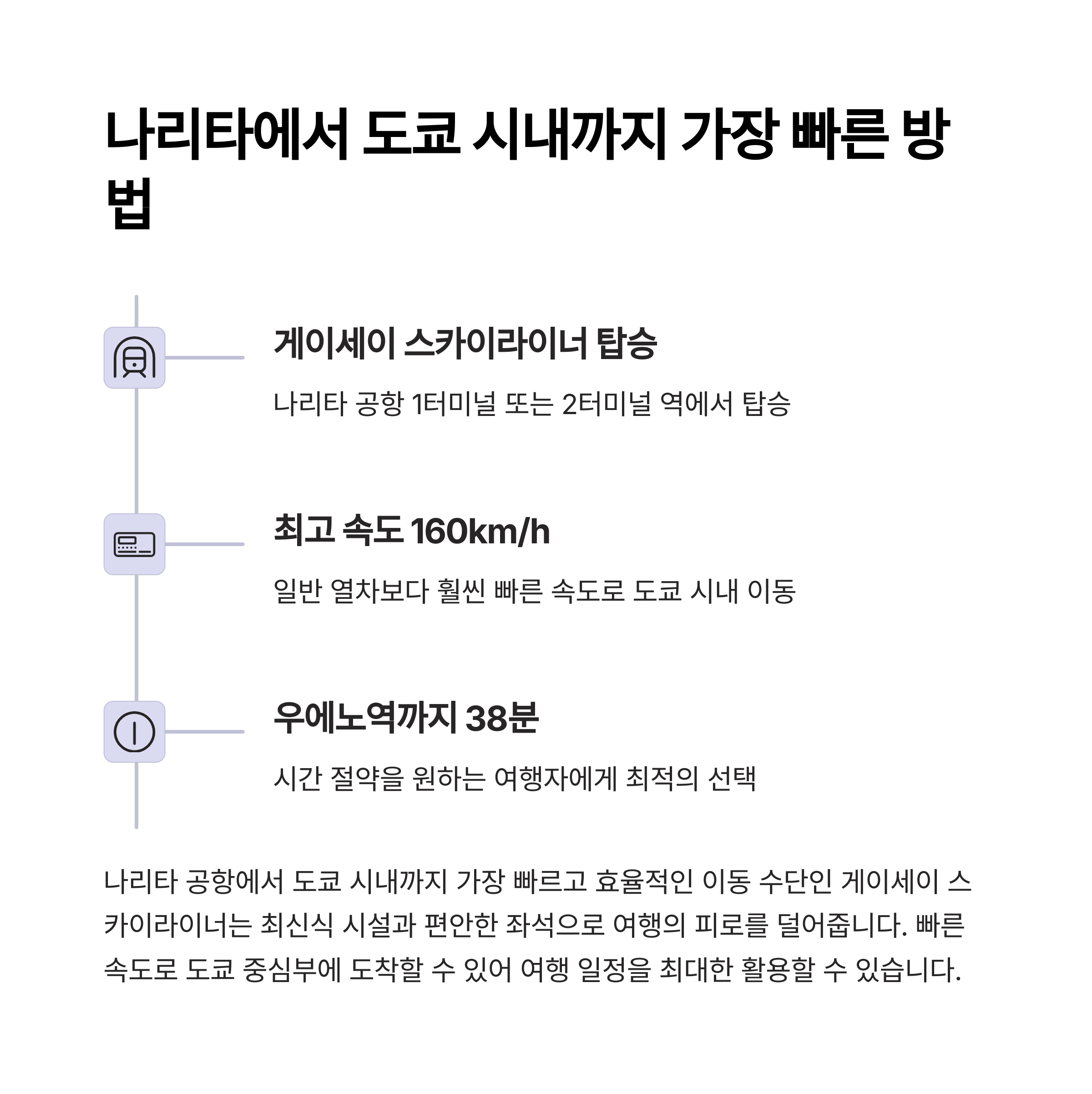 도쿄에서 공항으로 이동 시, 게이세이 스카이라이너는 빠르고 편리한 방법으로 추천됩니다.