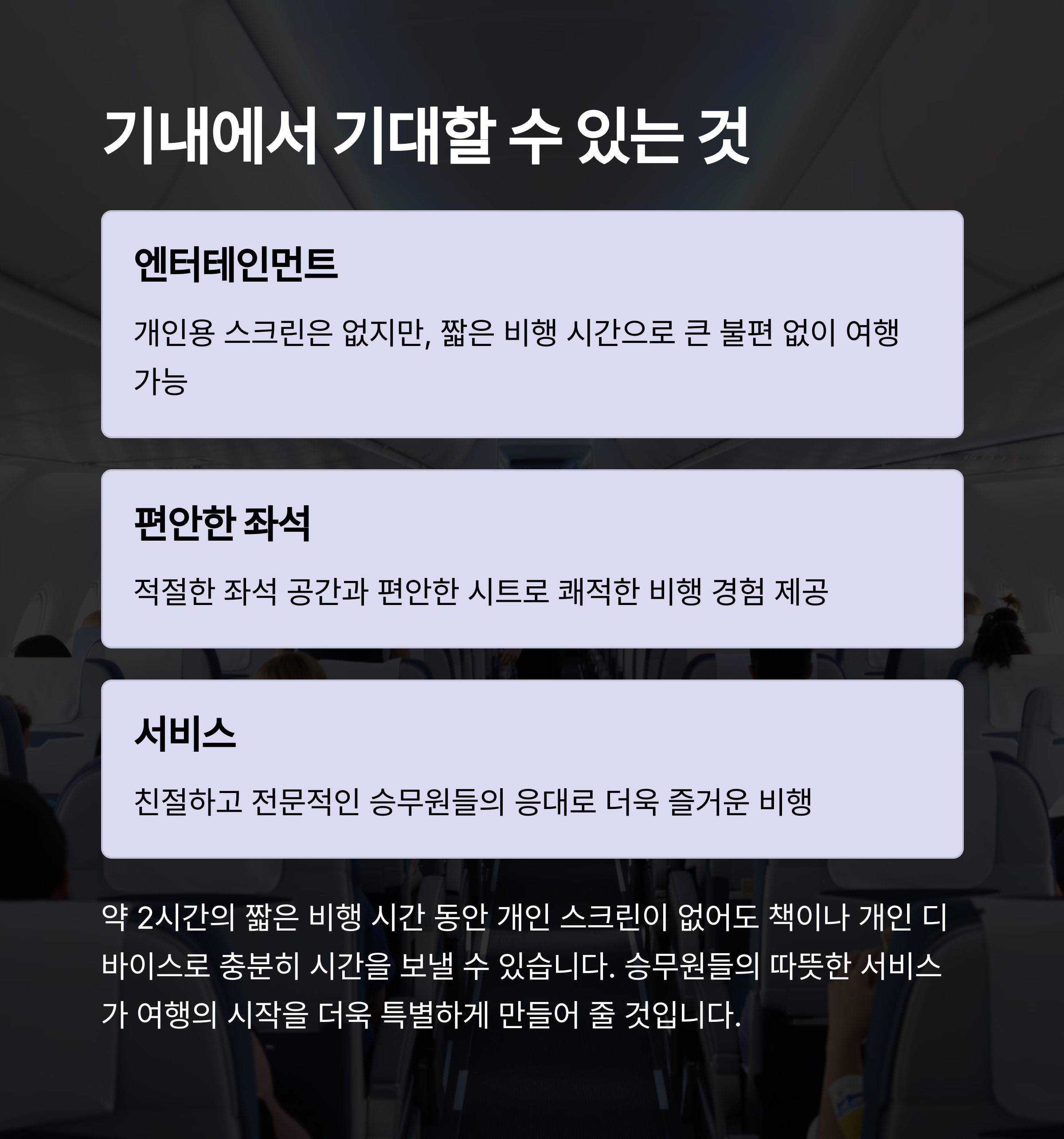 단, 기내 엔터테인먼트가 부족하기 때문에 짧은 비행 시간 중 휴대 기기의 활용이 추천됩니다.