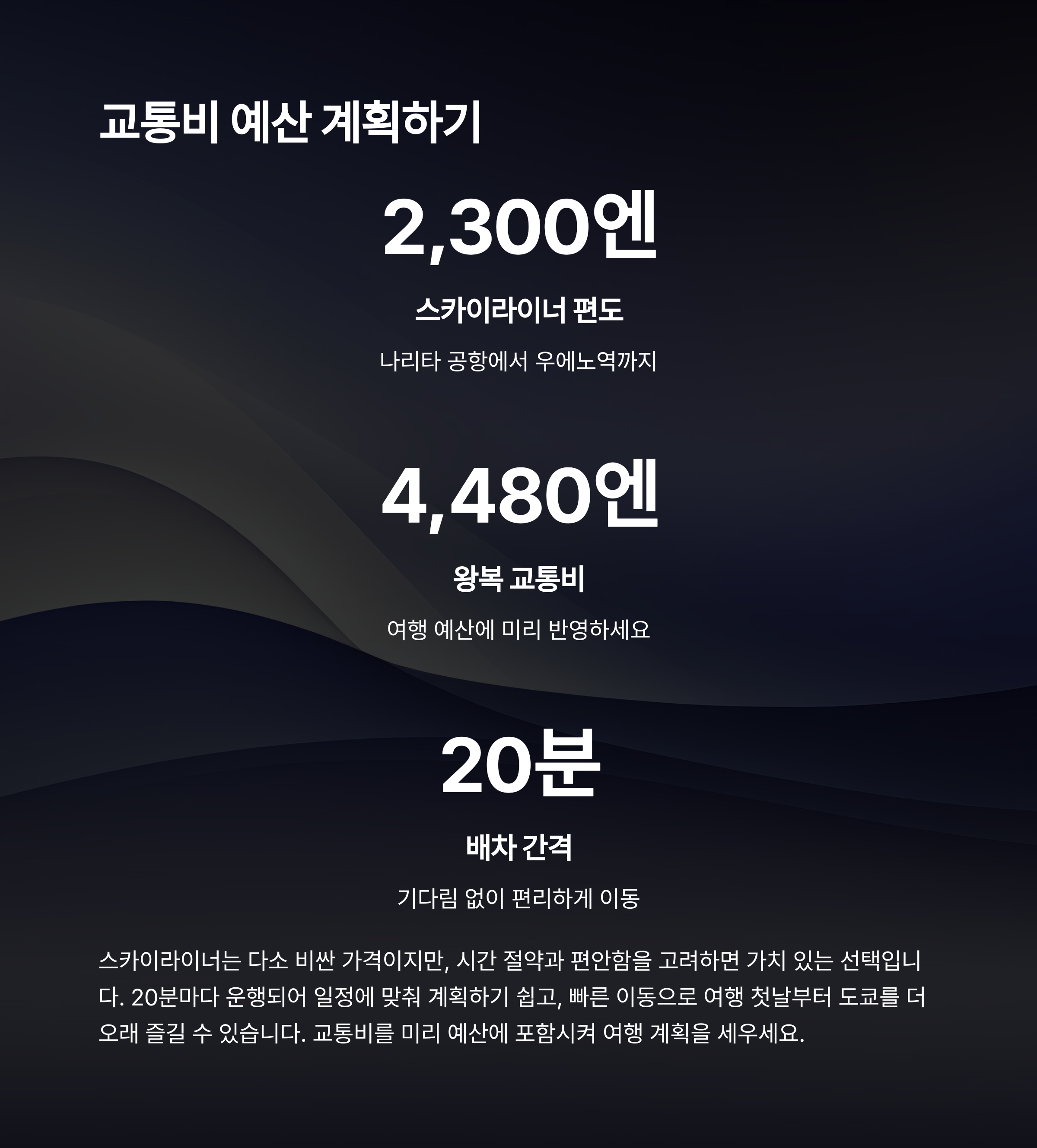 | 스카이라이너 | 38분 | 약 4,480엔 | ★★★★★ |
