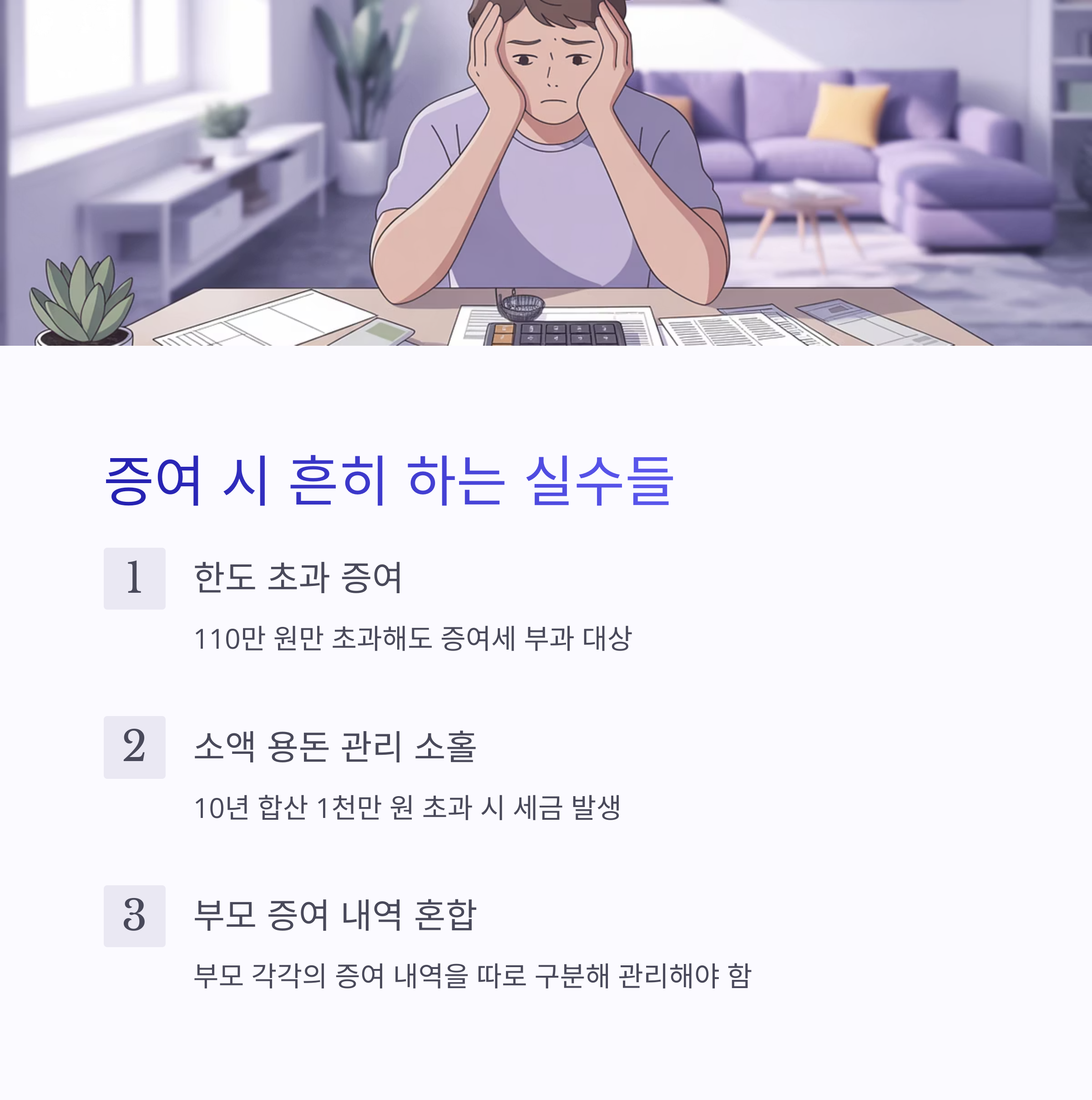 대표적인 실수는 한도를 넘겨 증여하면서 증여세가 발생하는 경우입니다.