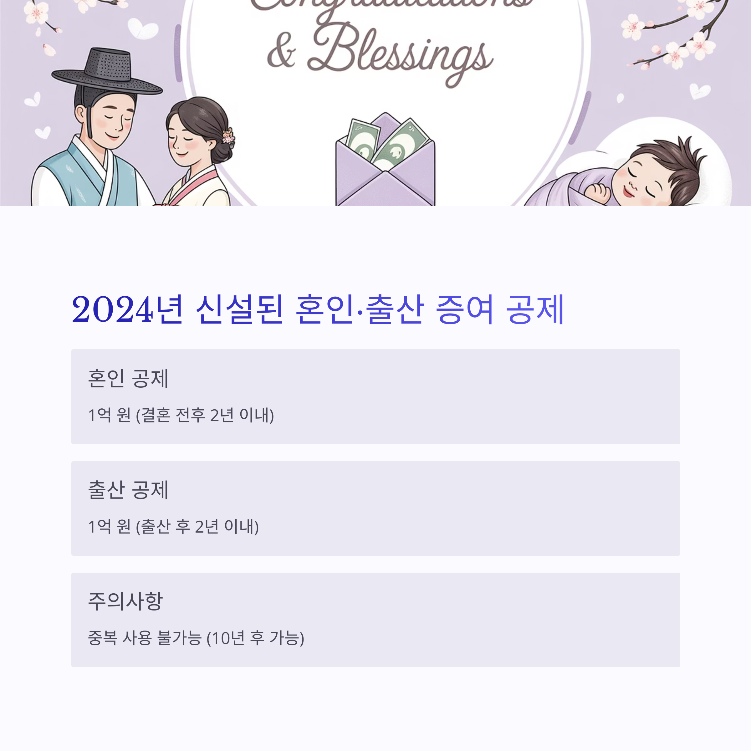 | 출산 공제 | 1억 원 | 출산 후 2년 이내 증여 |