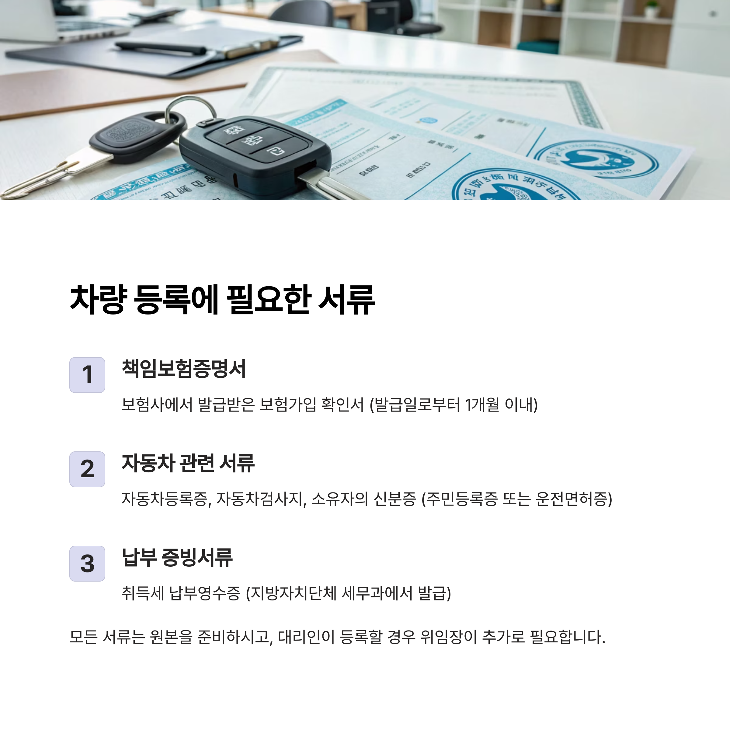 차량과 관련 서류(자동차등록증, 신분증, 책임보험 가입증명서 등)를 지참해 등록 사업소에서 등록을 진행합니다.