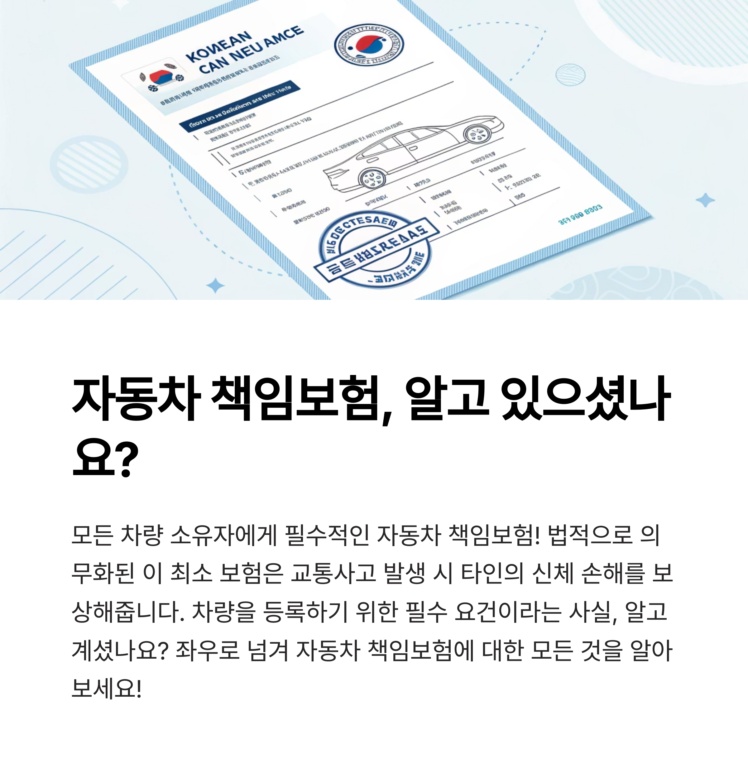 책임보험은 우리나라에서 차량을 운행하거나 등록하기 위해 반드시 가입해야 하는 의무보험입니다.