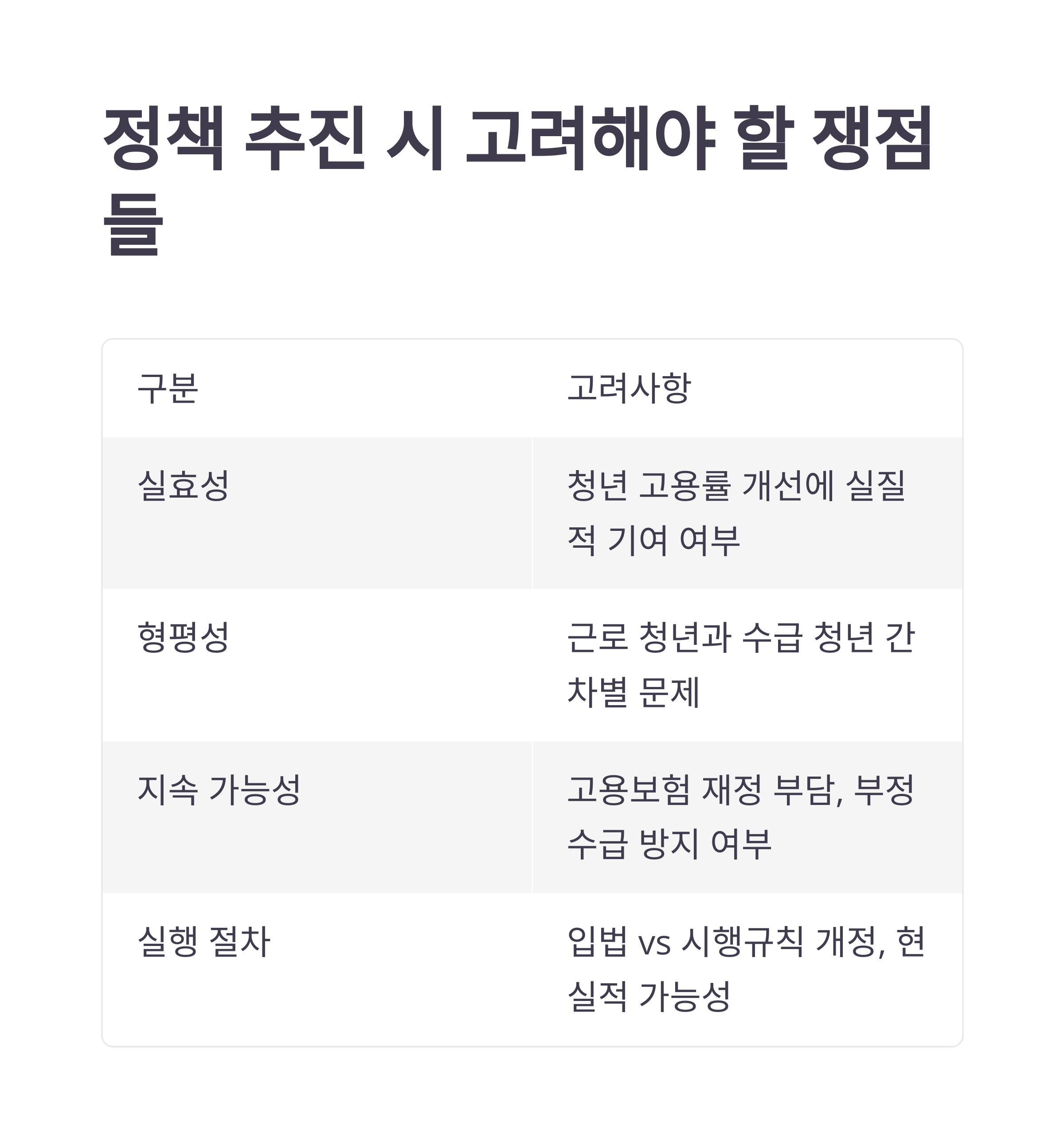 | 실효성 | 청년 고용률 개선에 실질적 기여 여부 |
