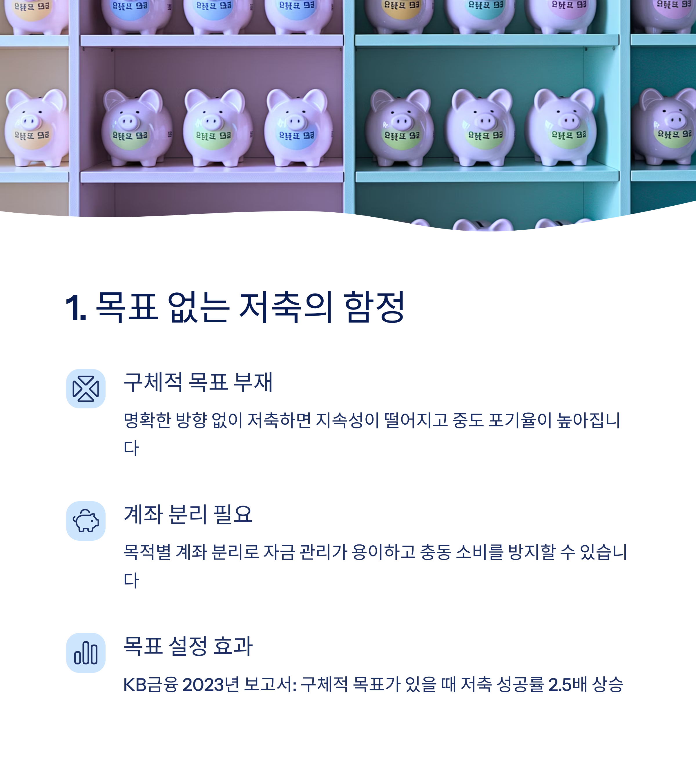 | 목표 없이 저축을 하면 지속성이 떨어지는 경향이 있습니다. 구체적인 계획 없이 모은 자산은 잘못된 소비로 이어질 수 있습니다. 장기적 목표가 없어 비상금 부족, 큰 지출 대비 등이 어렵게 됩니다. 정기적인 모니터링 없이 자산이 분산되어 활용되지 않을 수 있습니다. 저축 습관 유지를 위해 구체적이고 현실적인 목표 설정이 반드시 필요합니다. |