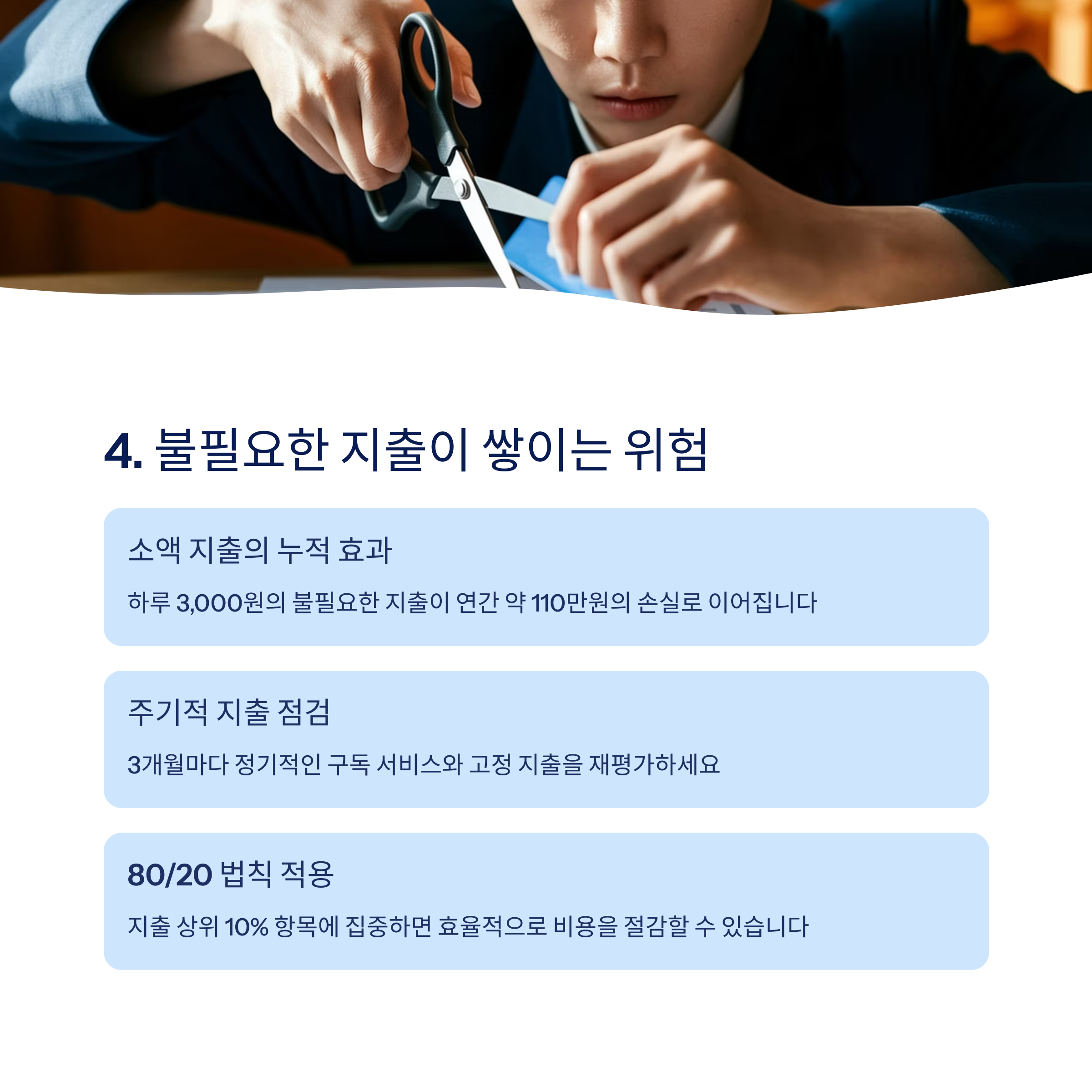 50/30/20 법칙처럼 구조적인 예산 계획을 활용합시다. 반복적인 소액 지출을 줄이는 것이 장기적인 재정 구성에 중요합니다.