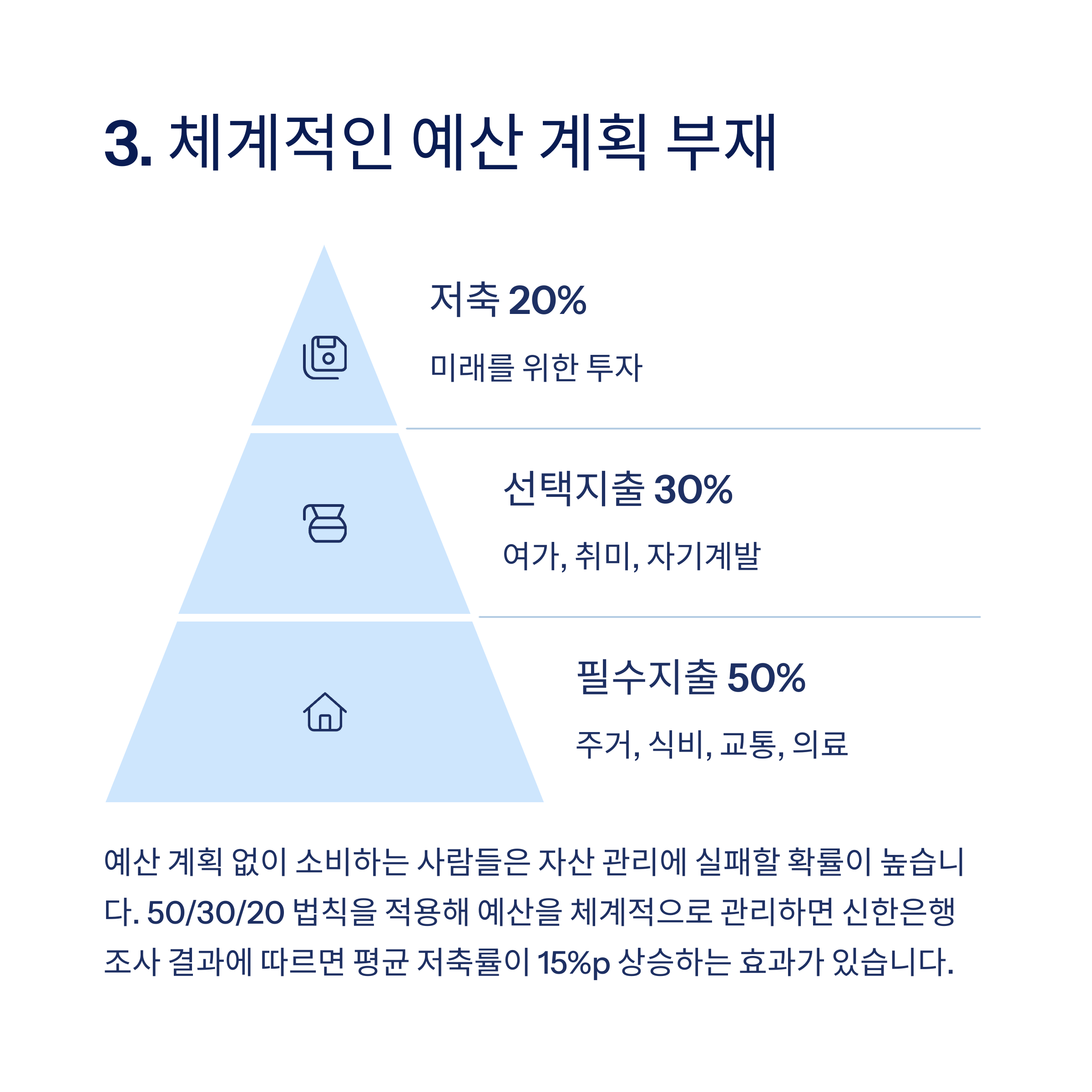 세 번째는 적절한 예산 계획의 부재입니다. 50/30/20 법칙을 준수하지 않는 다수의 가구는 과도한 소비로 인해 저축과 투자 여력이 감소되는 문제가 발생합니다.