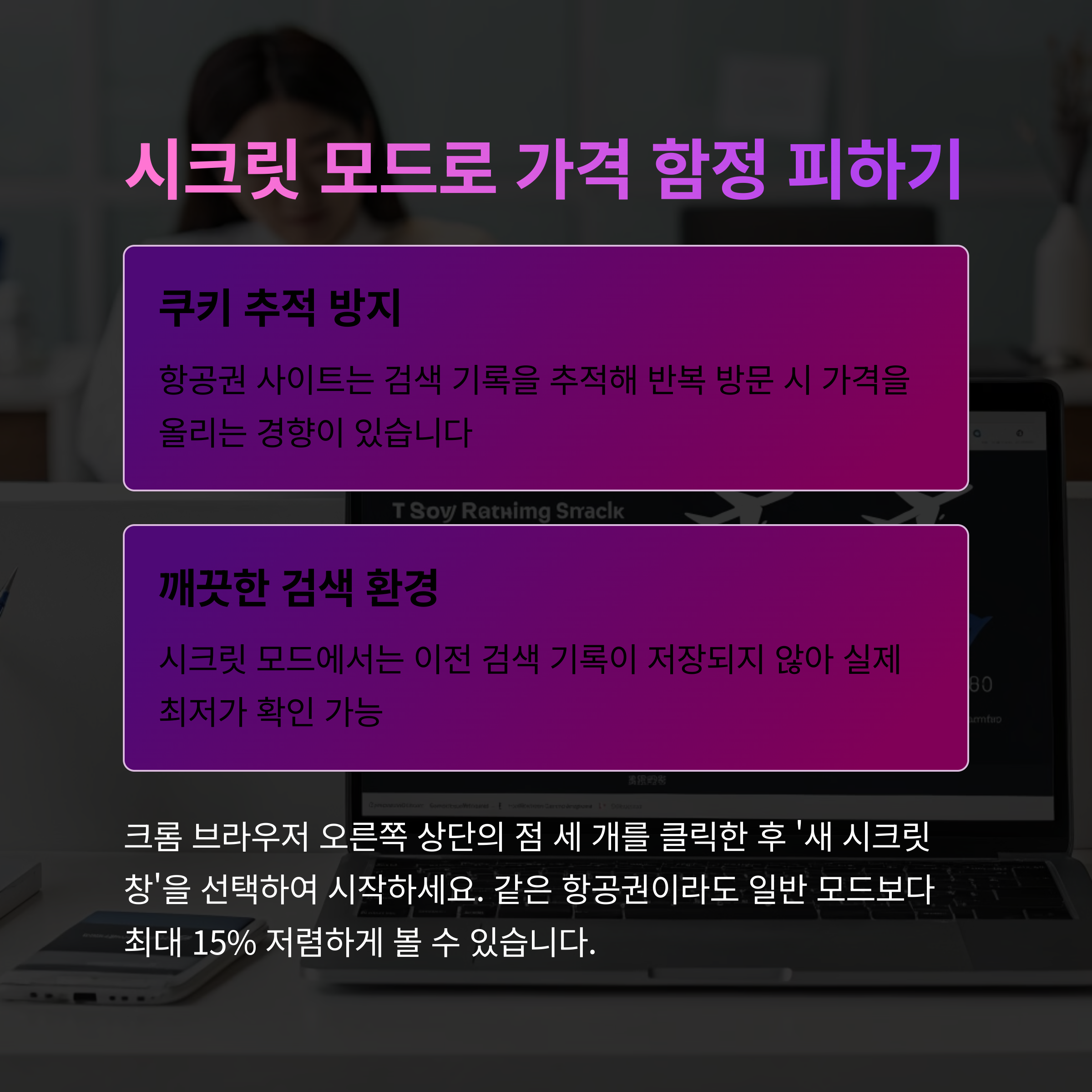 첫 번째 팁은 바로 크롬 시크릿 모드를 활용한 항공권 예약입니다. 항공권 예매 사이트는 사용자의 쿠키 정보를 수집해 조회 빈도가 높을수록 가격을 인상하는 경향이 있습니다. 크롬 시크릿 모드를 이용하면 쿠키 정보가 저장되지 않아, 가격이 오르지 않고 저렴한 가격으로 항공권을 예약할 수 있습니다. 또한, 이러한 방법은 다른 사용자의 검색 이력을 고려하지 않기 때문에 보다 공정한 가격을 확인할 수 있습니다.