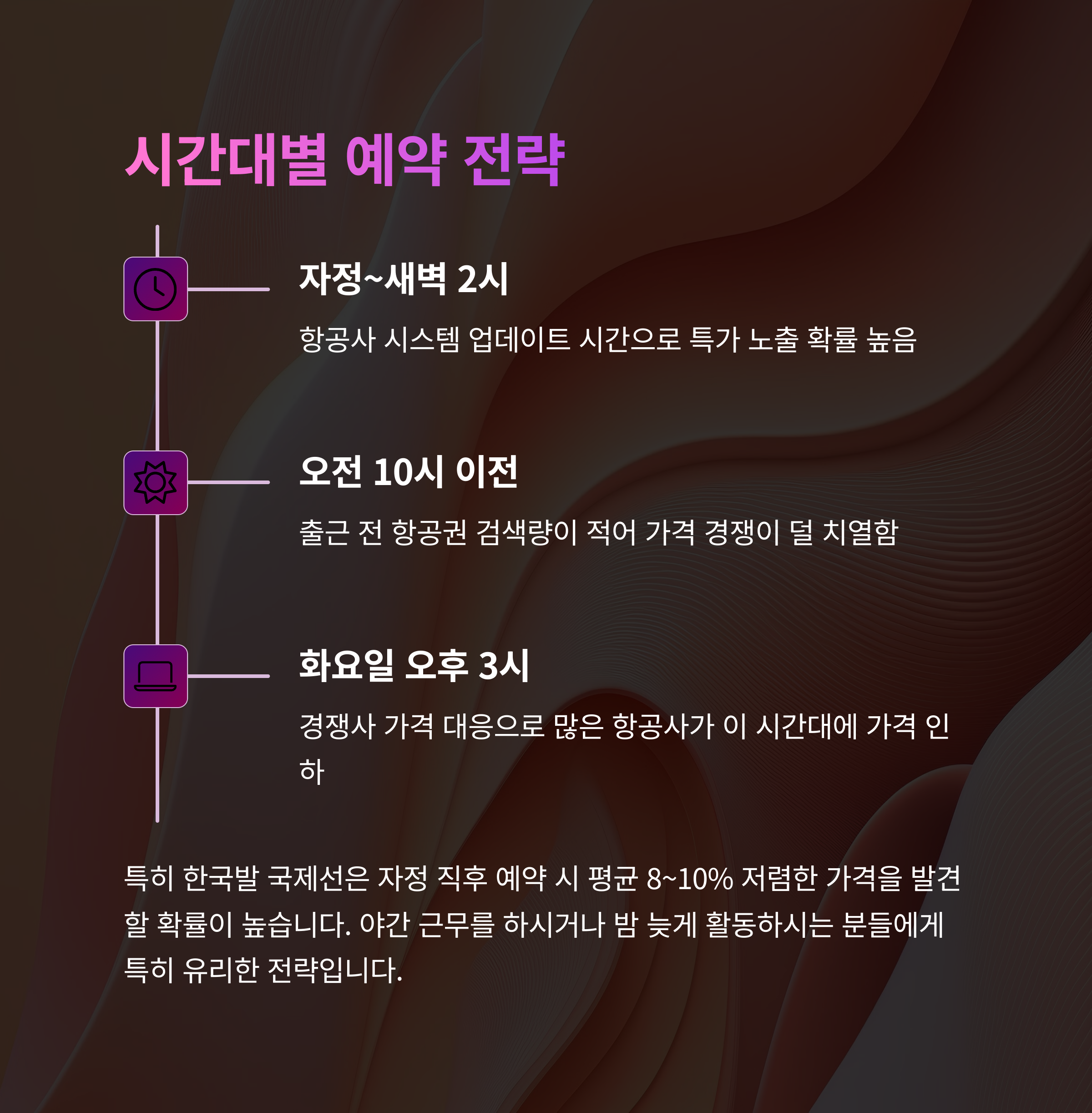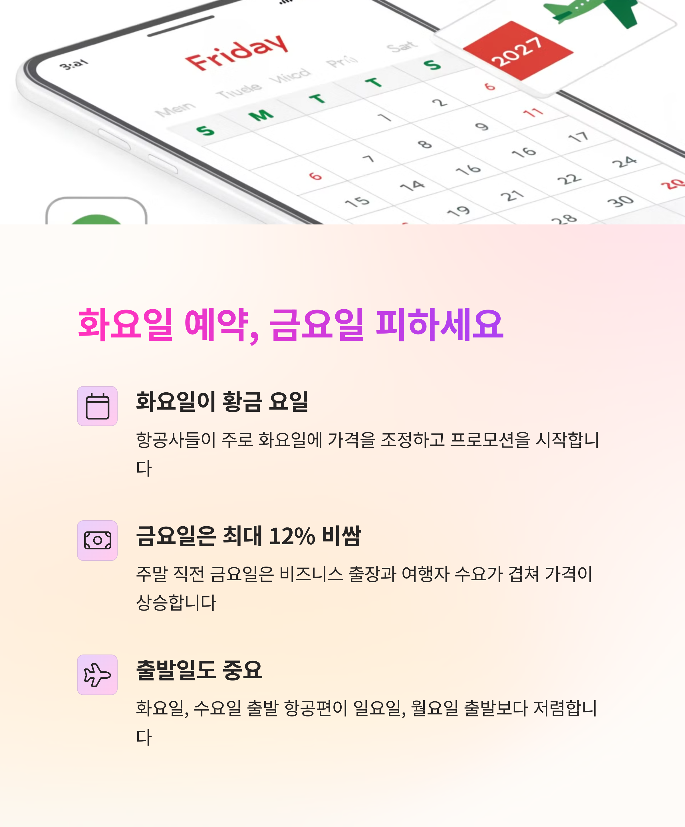 | 출국 약 21주 전 예약 | 화요일 예약이 가장 저렴 | 자정 또는 새벽 시간대 |