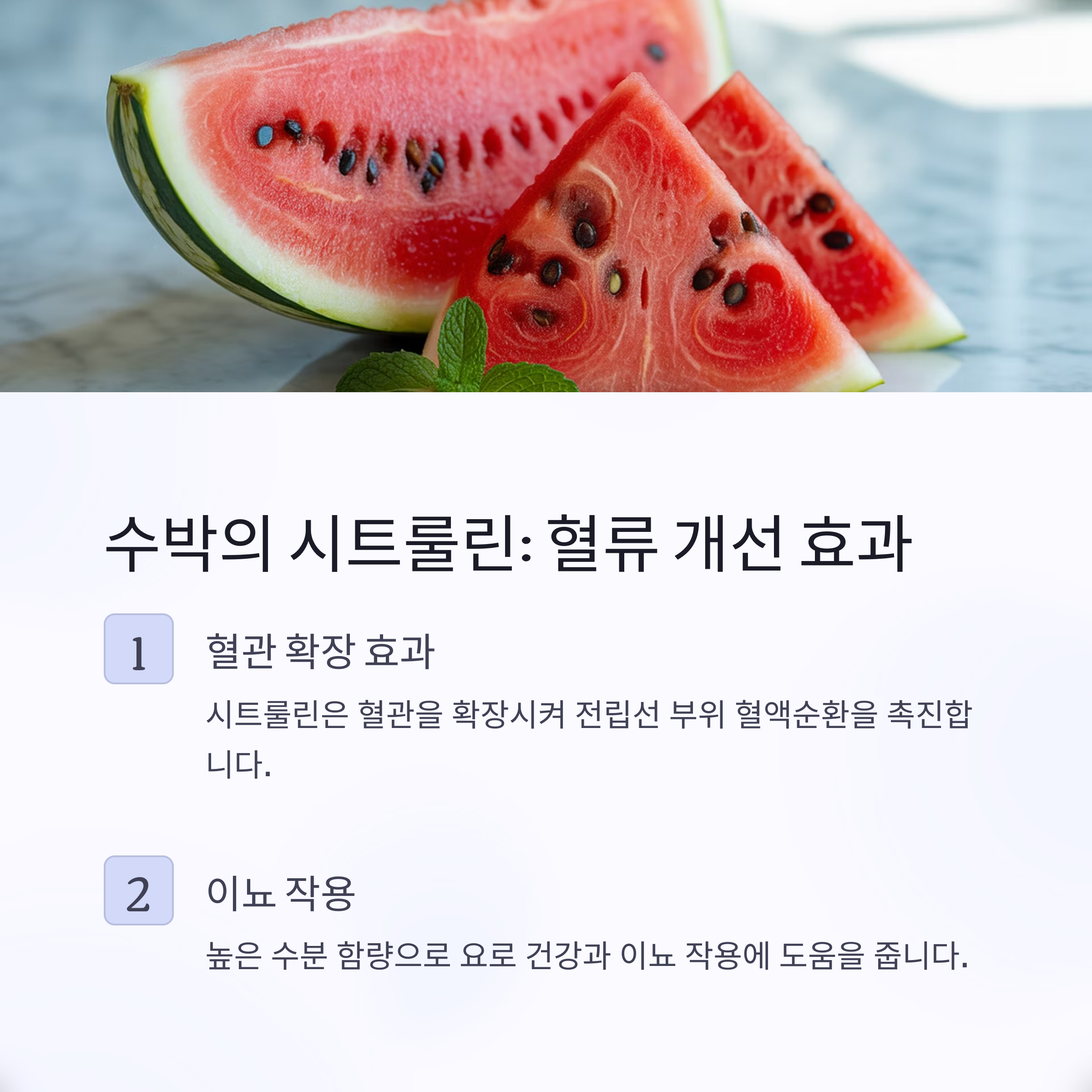 | 수박 | 시트룰린 | 혈류 개선, 이뇨 작용 |