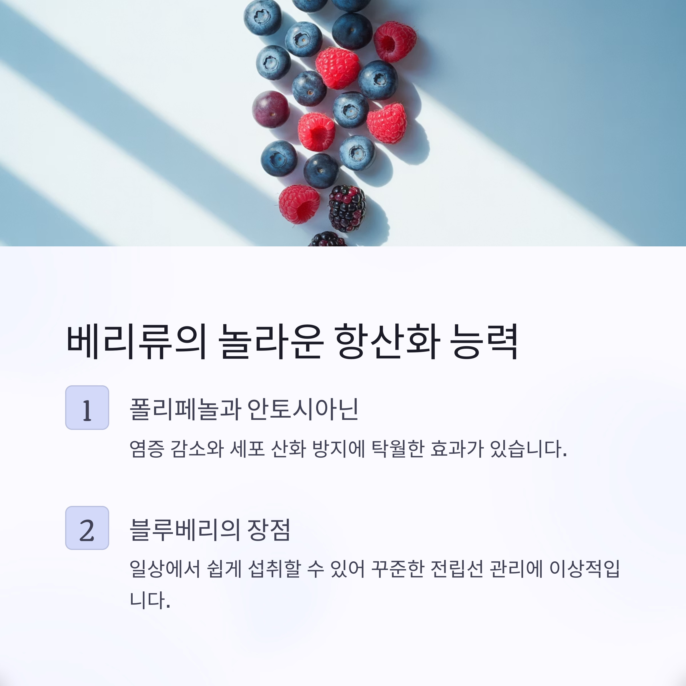 | 블루베리 | 안토시아닌 | 염증 완화, 세포 보호 |