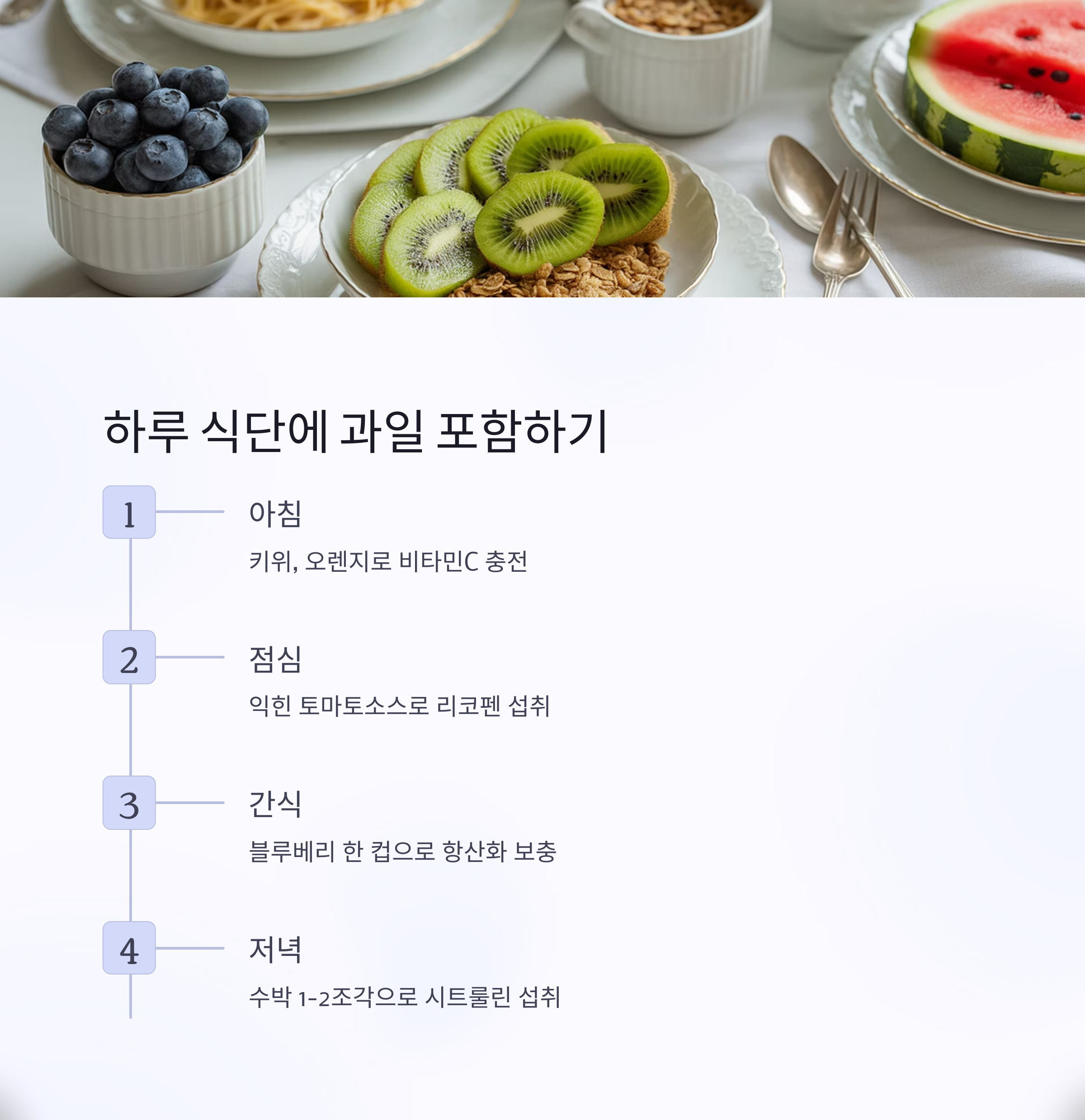 하루 식단에 과일을 어떻게 포함할 수 있는지 간단히 예시로 살펴봅니다.